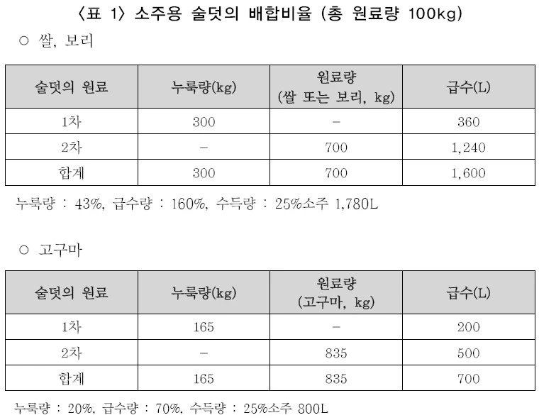 주로 사용되는 소주용 술덧의 배합비를 (표 1)에 나타내었다. 배합비의 주요한 포인트는 알코올 수득량이 많도록 설계되어 있다. 즉, 원료의 전분가가 높을수록 당화를 완전하게 시킬 수 있도록 누룩량을 많이 사용하였으며, 높은 알코올 농도에 의해 효모가 사멸하지 않도록 물량을 높여 술덧의 알코올 농도를 낮추었다. 예를 들어 쌀과 보리를 이용한 소주에서는 물 사용량의 원료의 160%가 일반적이지만 고구마는 수분이 많고 전분기가 낮기 때문에 70%의 급수비율을 가진다.