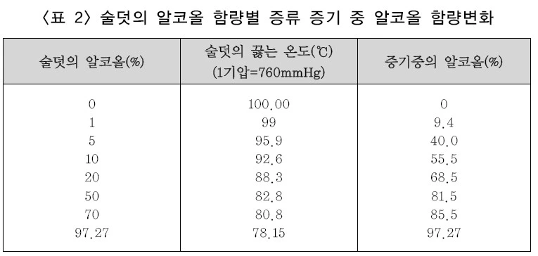 시간의 경과에 따라 알코올 농도가 낮아지는 이유는 알코올 증발에 의하여 원주의 알코올 함량이 낮아지고 이에 따라 증기중의 알코올 농도도 낮아지기 때문이다. 많은 사람들이 술을 증류하면 알코올부터 끓어 올라오고 그다음 물이 끓어 올라올 것이라고 생각한다. 그러나 (표 2)에서 보듯이 10% 술덧을 증류하면 증기 중의 알코올 함량은 55.5%이고 44.5%는 물이다. 결국 물과 알코올이 동시에 끓어 올라오는데 술덧의 알코올 함량에 따라 그 비율이 결정되는 것이다.
