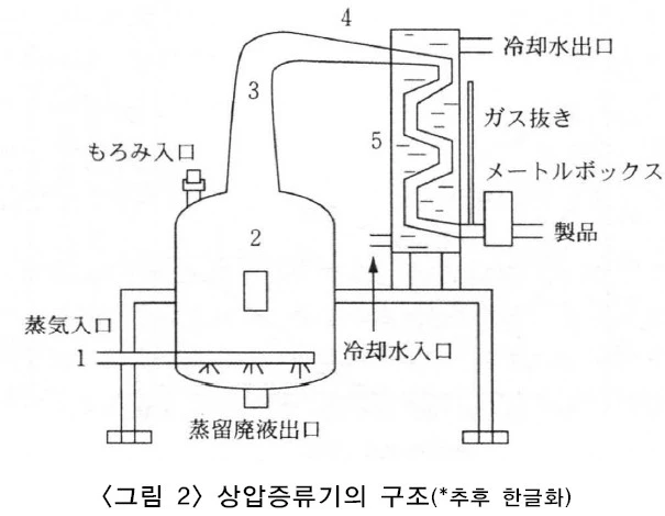 단식 상압증류기의 구조를 (그림 2)에 나타내었다. 1번은 증기가 들어가는 관으로 증기는 직접 술덧에 접촉된다. 2번은 증류솥으로 재질은 철, 동 등으로 되어 있었으나 최근에는 스테인리스 재질이 대부분을 차지하고 있다. 3번과 4번은 알코올 증기를 모아 냉각기로 이송시켜주는 이송관이며, 특히 4번의 높이와 굵기의 변화에 의해 유출하는 미량성분이 다르기 때문에 소주의 향미에 있어 중요한 부위로 재질은 철, 동, 스테인리스 등이나 제품의 맛을 부드럽게 한다는 이유로 주석도 사용되고 있다. 5번은 냉각기로 증기중의 알코올을 냉각시켜 액체로 만들어 주며 알코올계가 설치되어 있어 유출되는 알코올농도를 상시 확인할 수 있다.