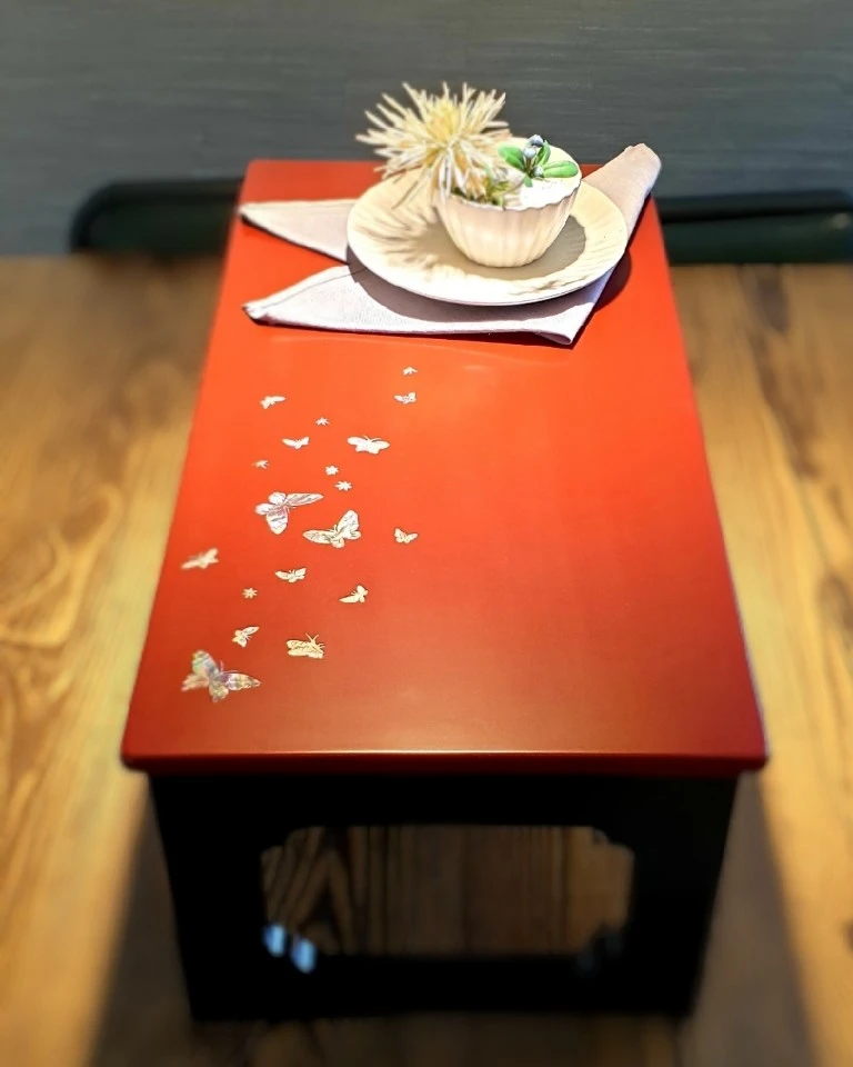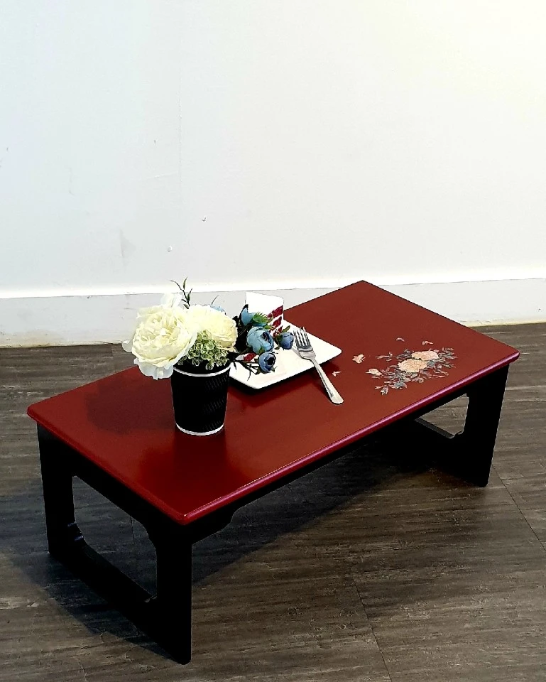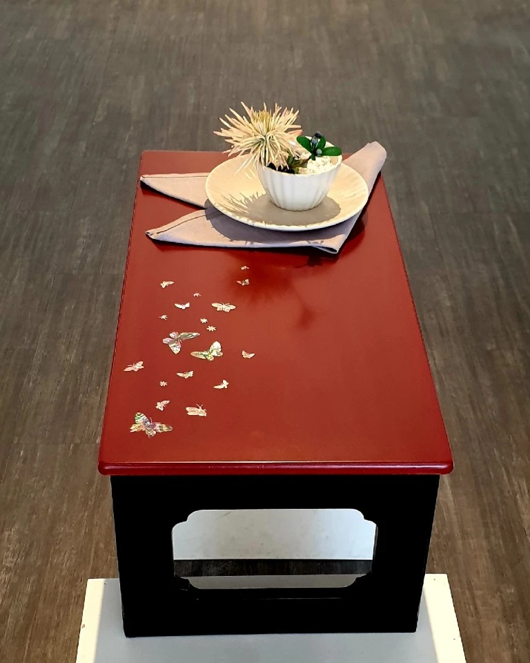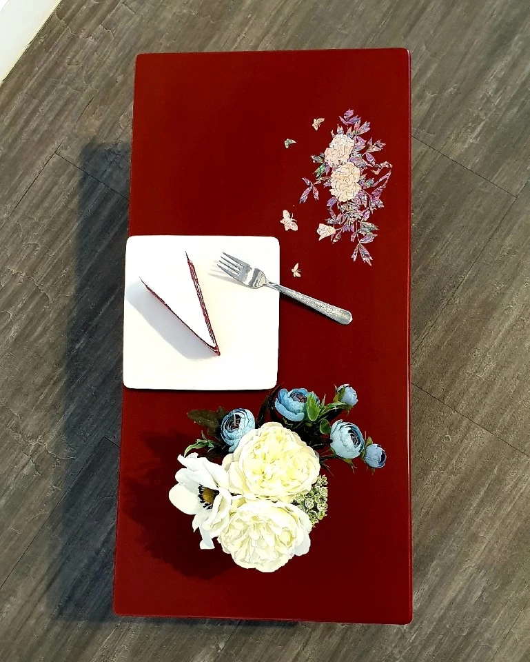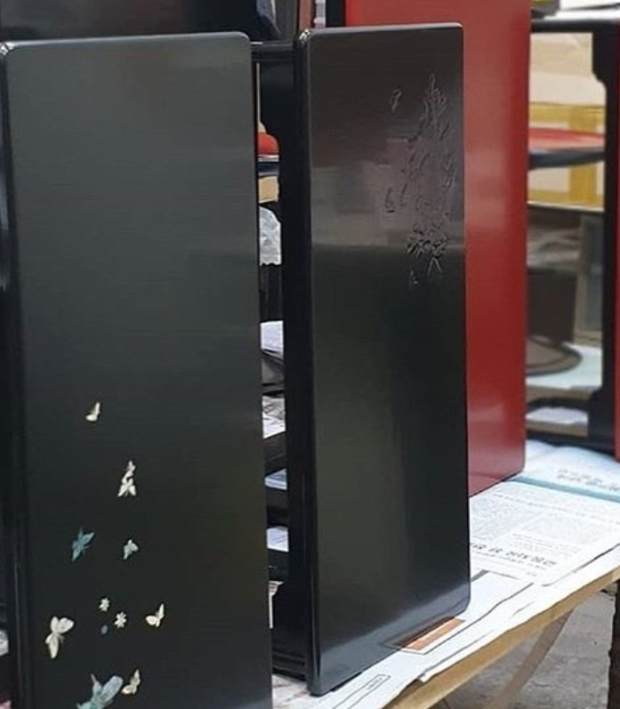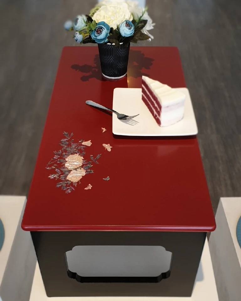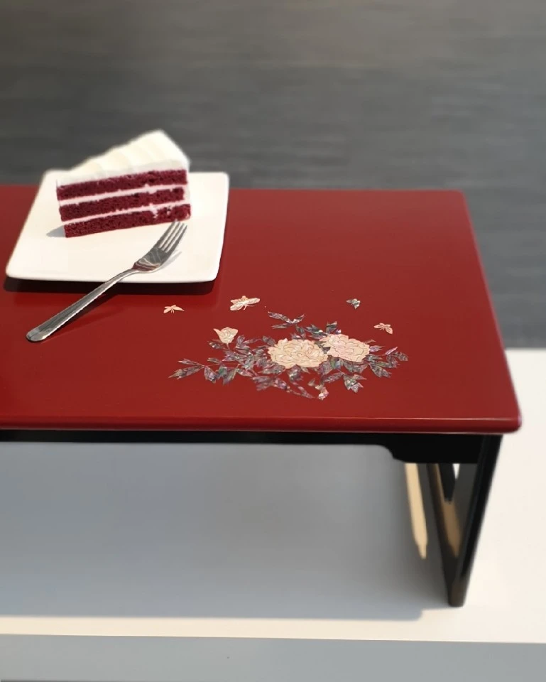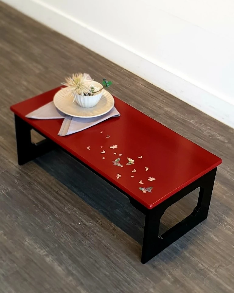 하얀술 고객 서비스 나전칠기 소반입니다. 전통 짜맞춤 강원반입니다. 뒤틀림 방지를 위해 자작나무합판을 사용했습니다. 자개박이는 모란꽃 문양과 나비 문양 두 종류 입니다. 상판은 주칠 옻칠로 마감했고 다리는 흑칠 옻칠로 마감했습니다.