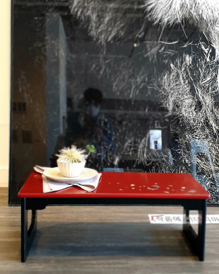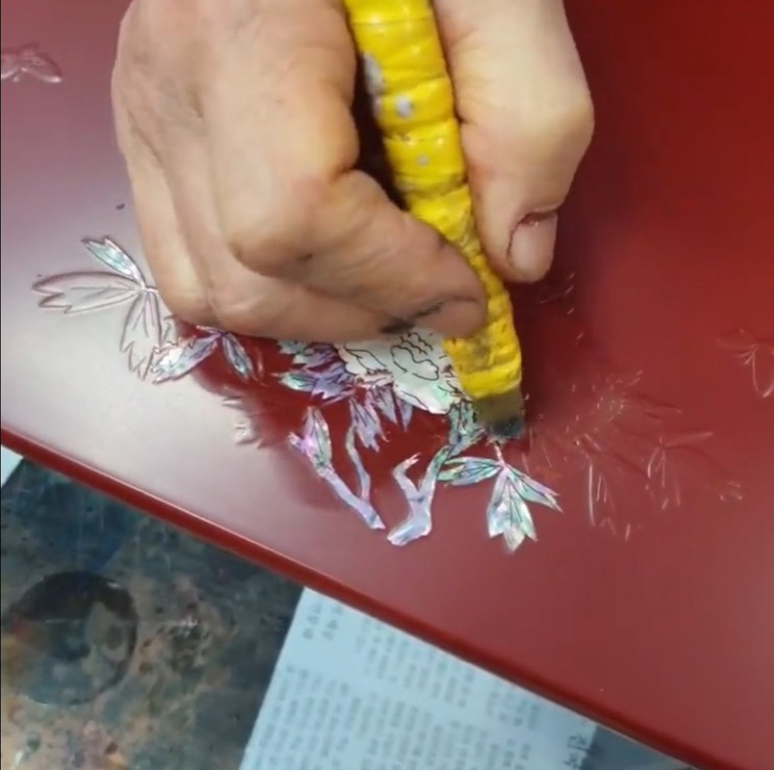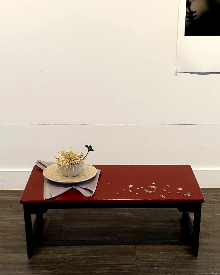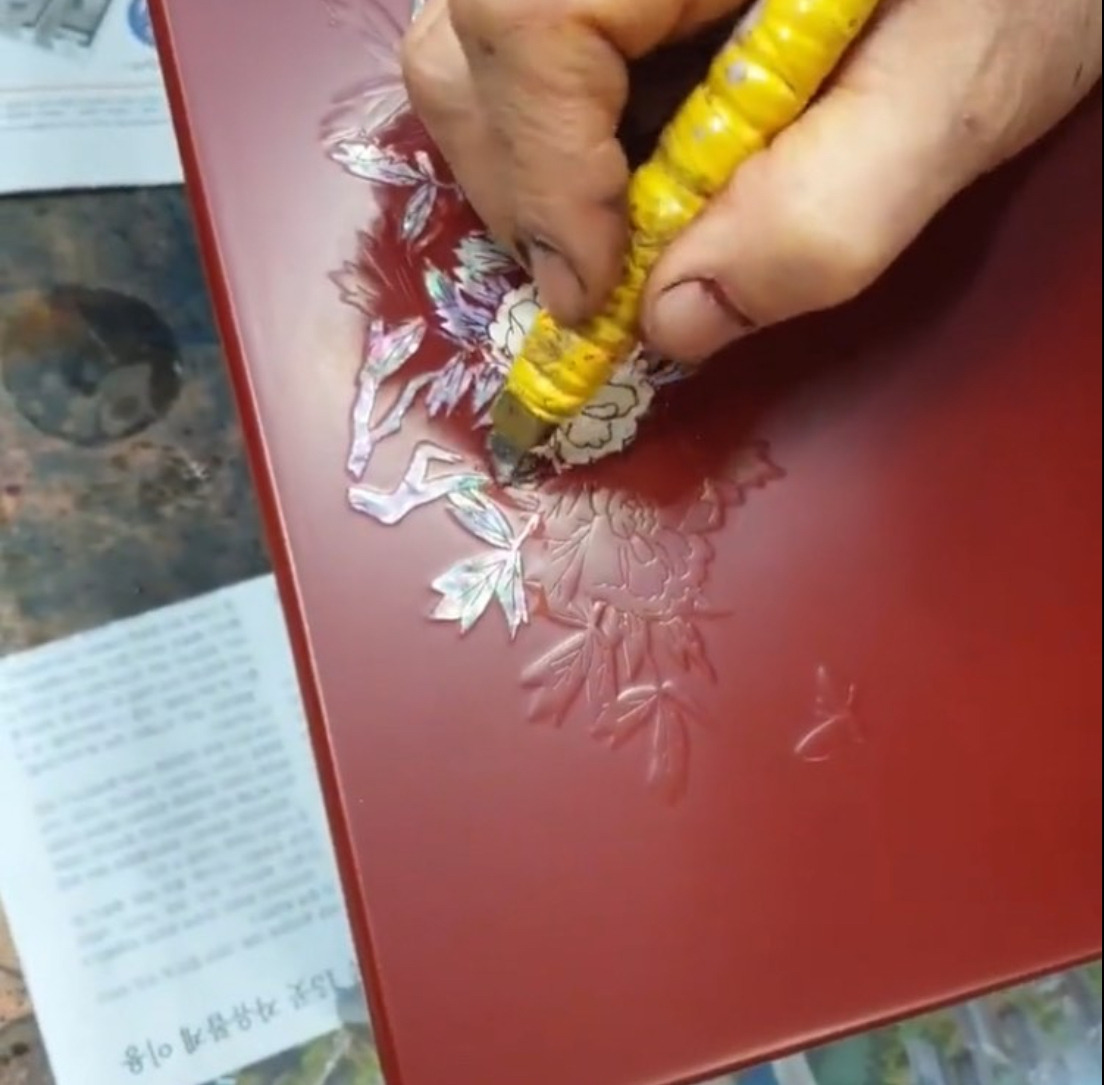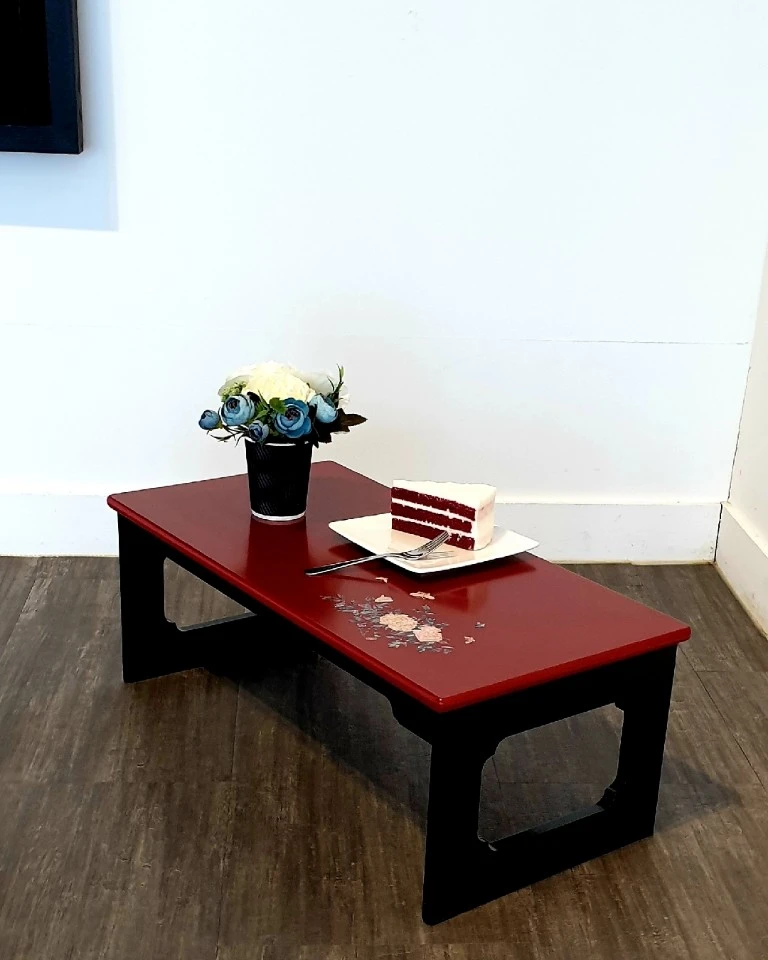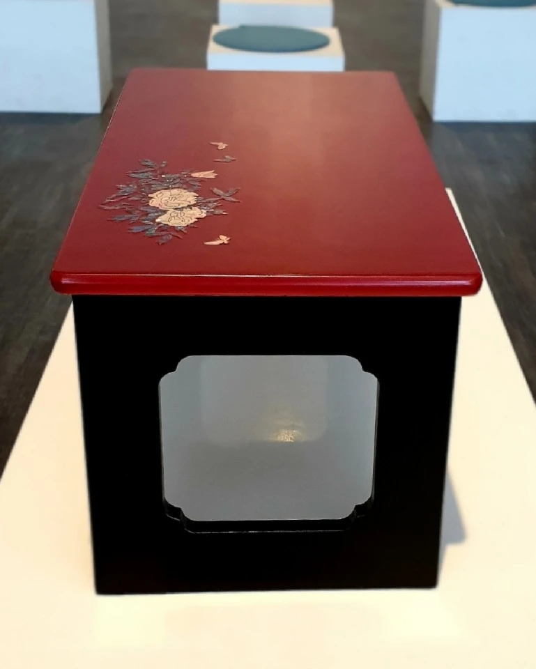 하얀술 고객 서비스 나전칠기 소반입니다. 전통 짜맞춤 강원반입니다. 뒤틀림 방지를 위해 자작나무합판을 사용했습니다. 자개박이는 모란꽃 문양과 나비 문양 두 종류 입니다. 상판은 주칠 옻칠로 마감했고 다리는 흑칠 옻칠로 마감했습니다.