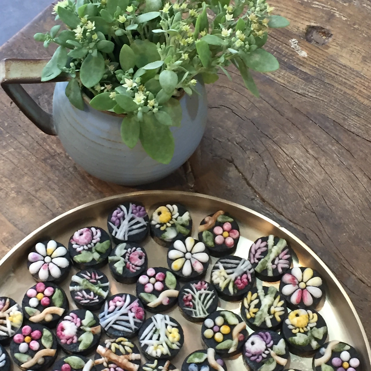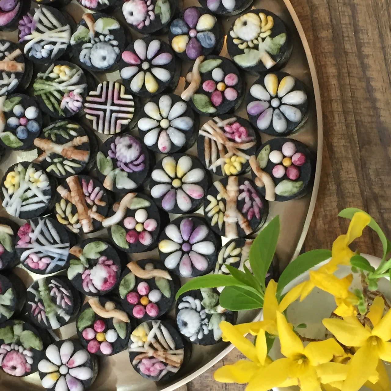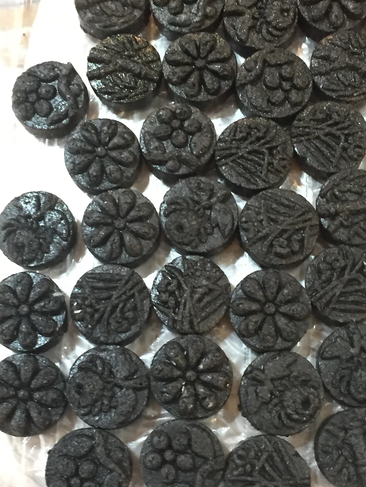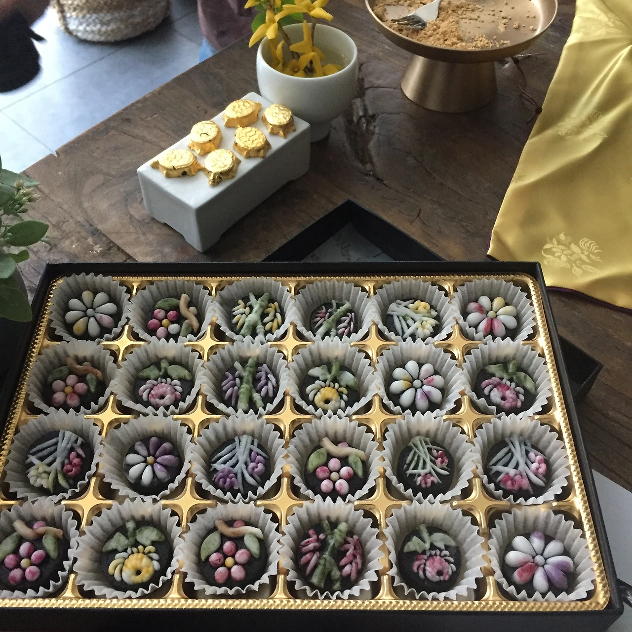 흑임자 꽃다식 만들기1. 흑임자, 물엿, 소금을 섞어 반죽한다.2. 김이 오르는 찜기에 흑임자 반죽을 10분 찐다.3. 따듯할 때 절구로 찧어 노루지로 기름을 뺀다.4. 흑임자 반죽을 다시 10분 찐다.5. 슈가파우더를 석어 반죽한 후 절구로 찧어 노루지로 기름을 빼서 반죽을 완성한다.6. 반죽은 구절판 두께 X 10cm 크기로 만들어 둔다.