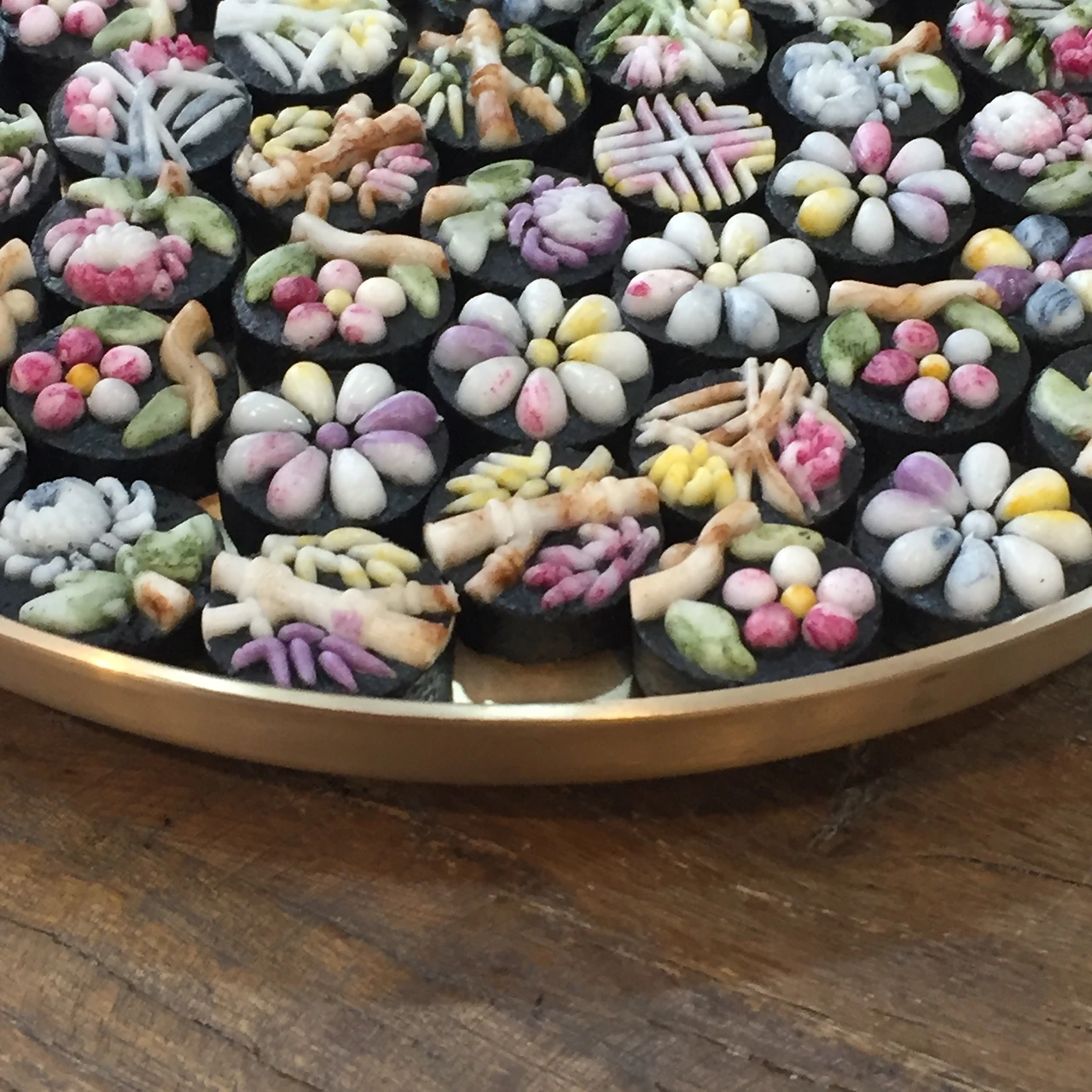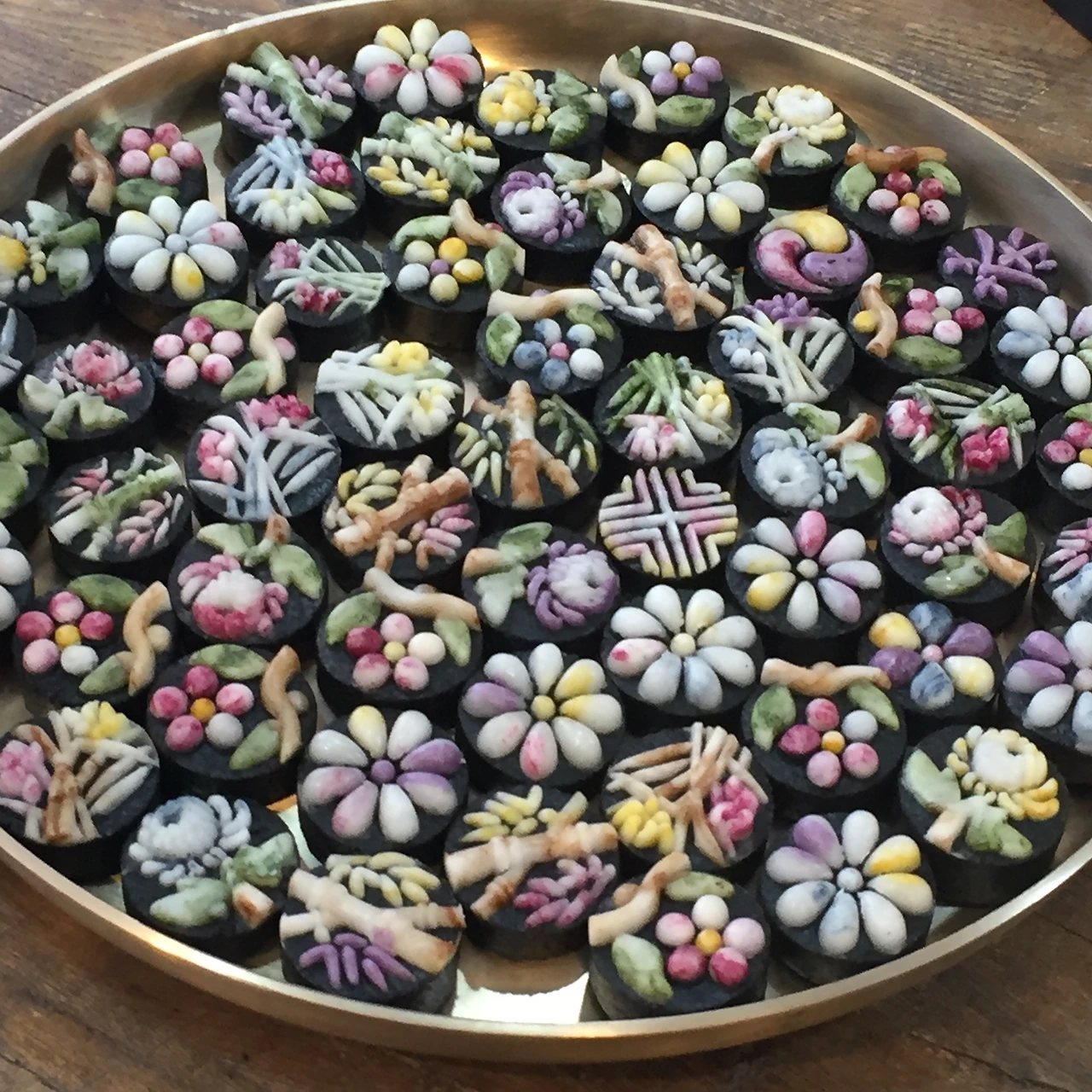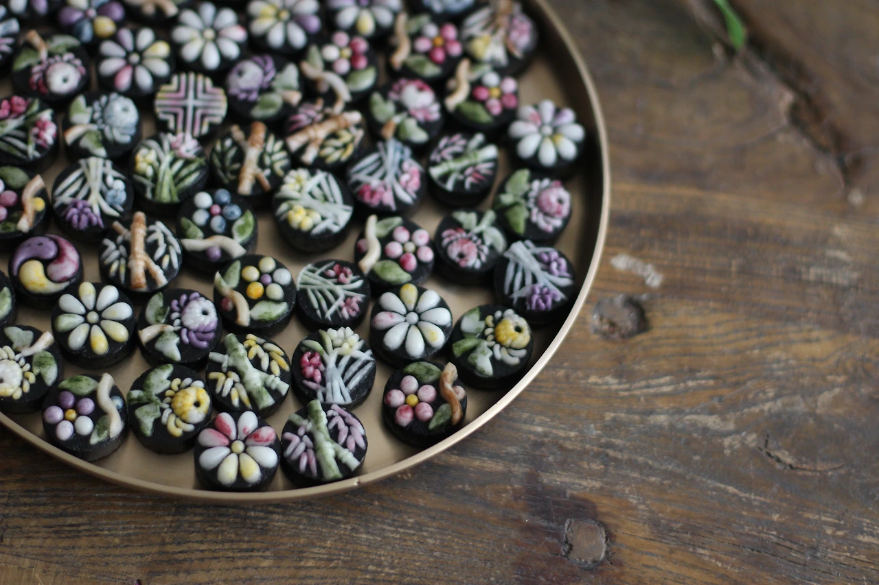 흑임자 꽃다식 만들기1. 흑임자, 물엿, 소금을 섞어 반죽한다.2. 김이 오르는 찜기에 흑임자 반죽을 10분 찐다.3. 따듯할 때 절구로 찧어 노루지로 기름을 뺀다.4. 흑임자 반죽을 다시 10분 찐다.5. 슈가파우더를 석어 반죽한 후 절구로 찧어 노루지로 기름을 빼서 반죽을 완성한다.6. 반죽은 구절판 두께 X 10cm 크기로 만들어 둔다.