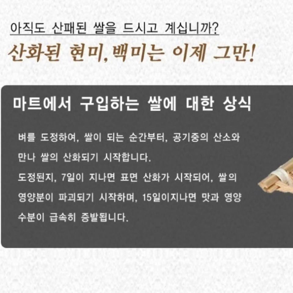 벼를 도정하는 순간부터 쌀은 공기중의 산소를 만나 산패되기 시작합니다. 도정후 7일이면 쌀 표면의 산화와 영양 손실, 변성이 시작되고 15일이면 맛, 영양, 수분이 급속히 증발됩니다.