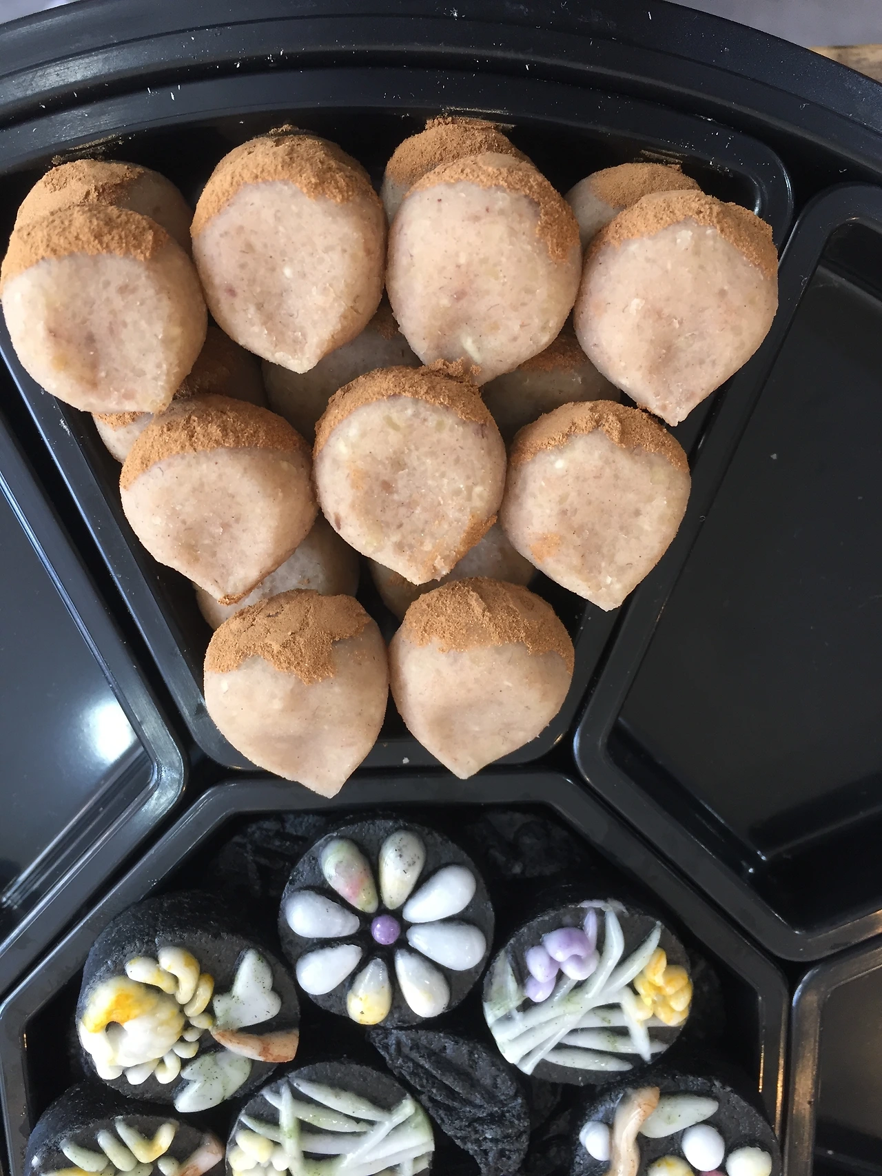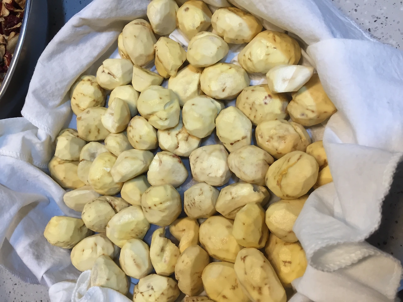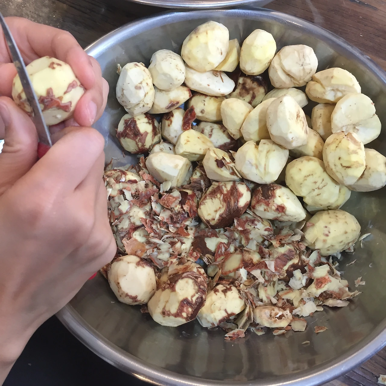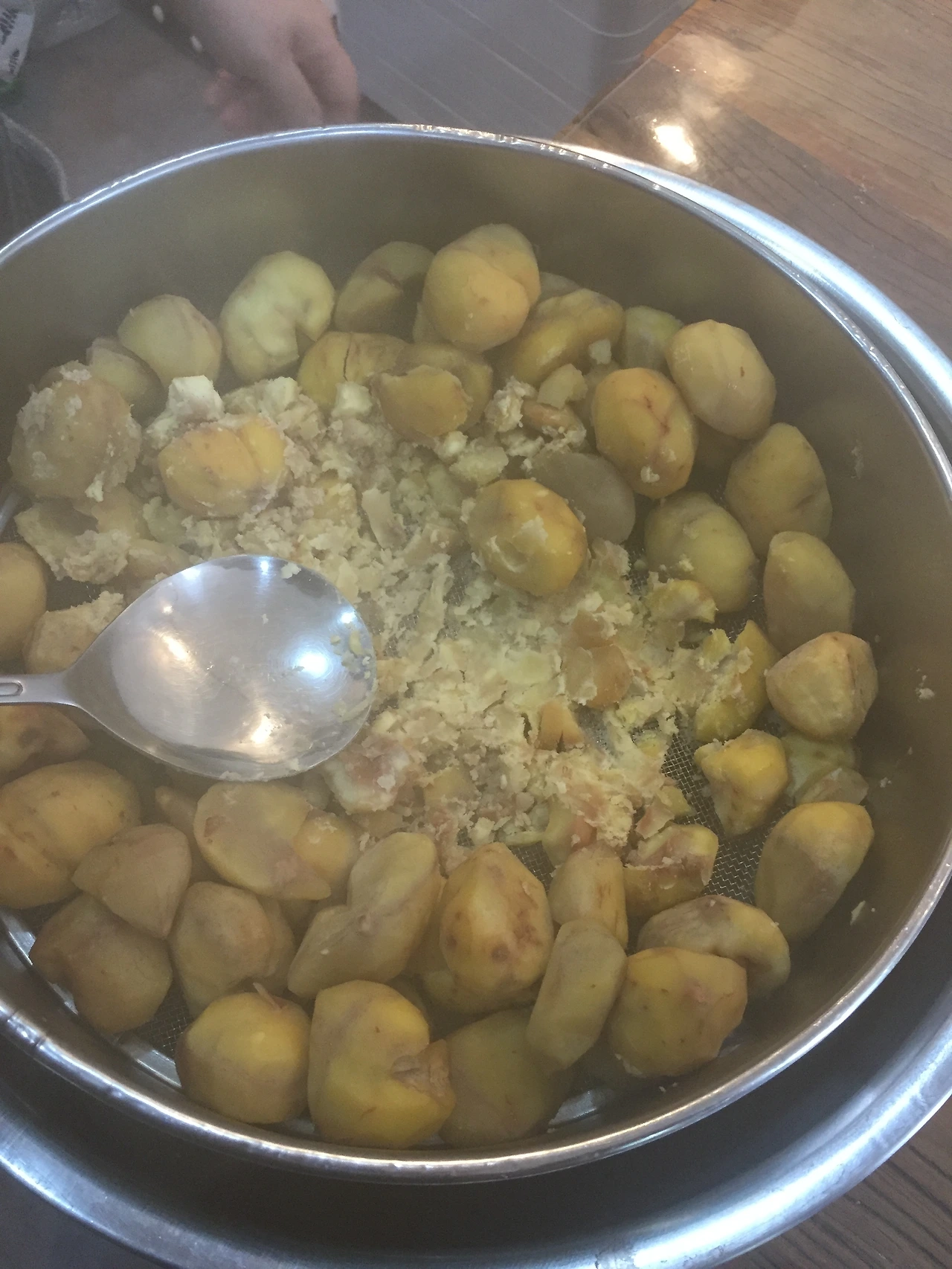 재료밤 500g꿀 2 1/2Ts설탕 2-3Ts소금 1/4ts계피가루 1/4ts잣가루 1/4C만들기1. 끓는 찜기에 밤 30분만에 찐다.2. 뜨거울때 밤을 체 내린다.3. 밤, 꿀, 설탕, 소금, 계피가루 고루 섞는다.4. 5g 밤톨을 만들어 계피를 묻힌다.