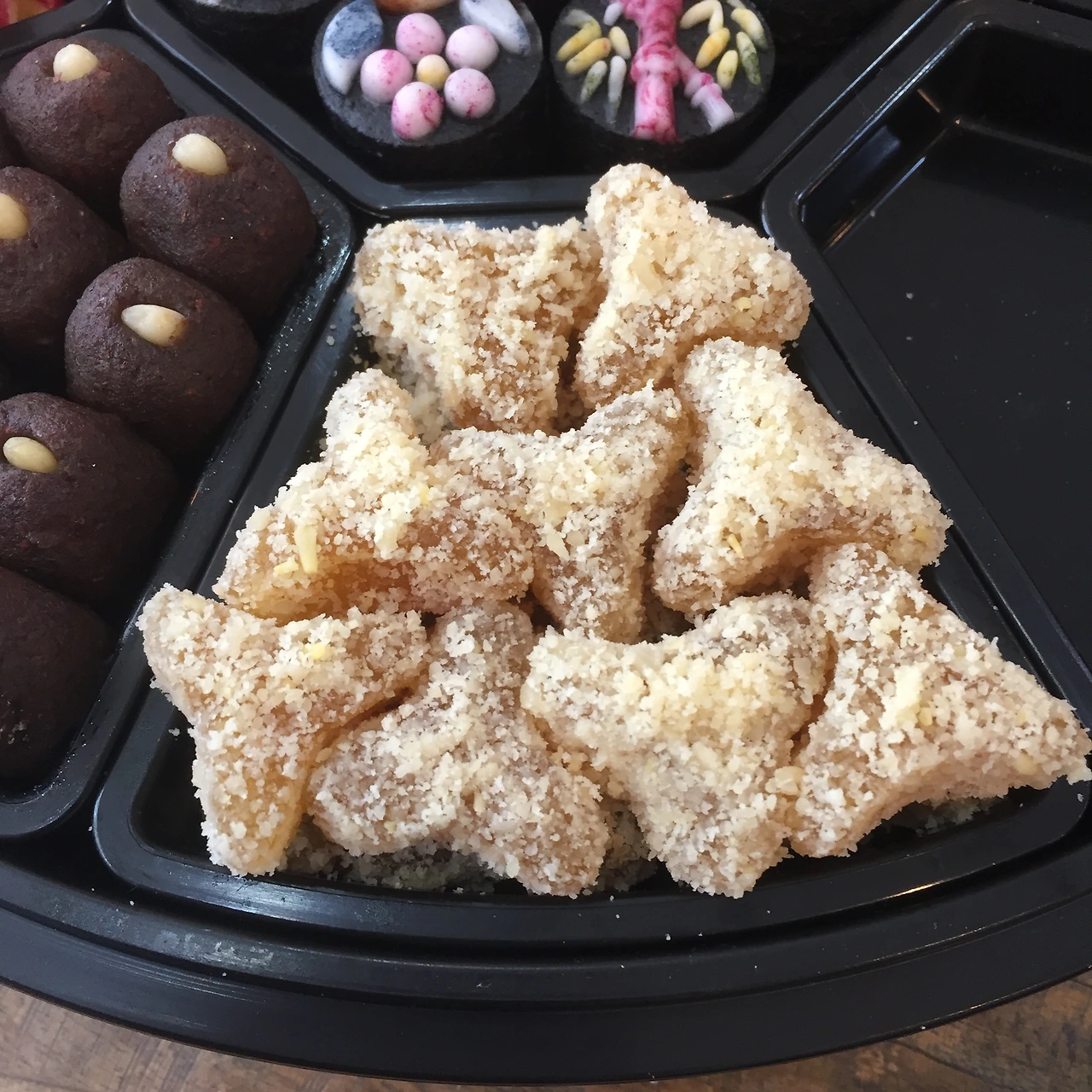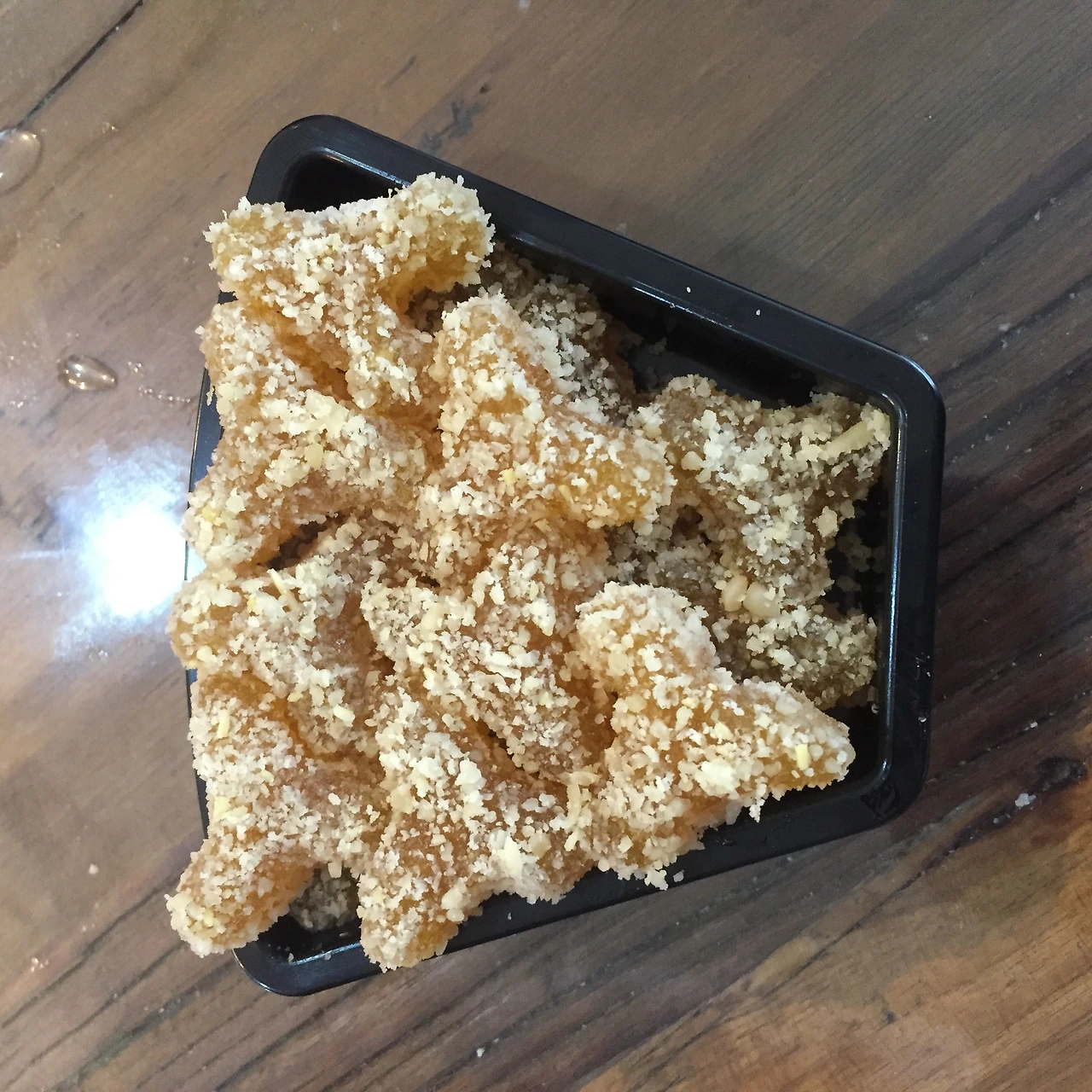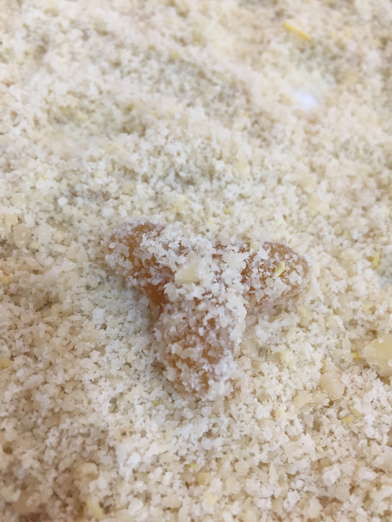 5. 한림 나가면 손에 설탕물(물:설탕=1:1)을 묻혀가며 5g 생강모양(세 뿔)을 만들어 잣가루에 굴린다.