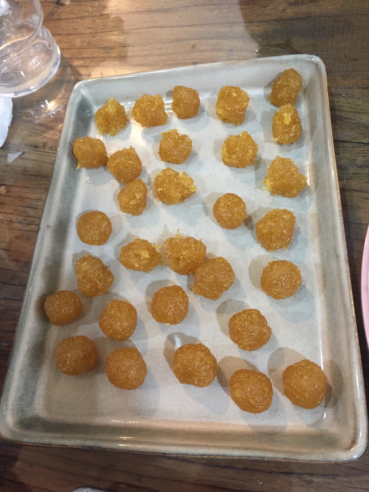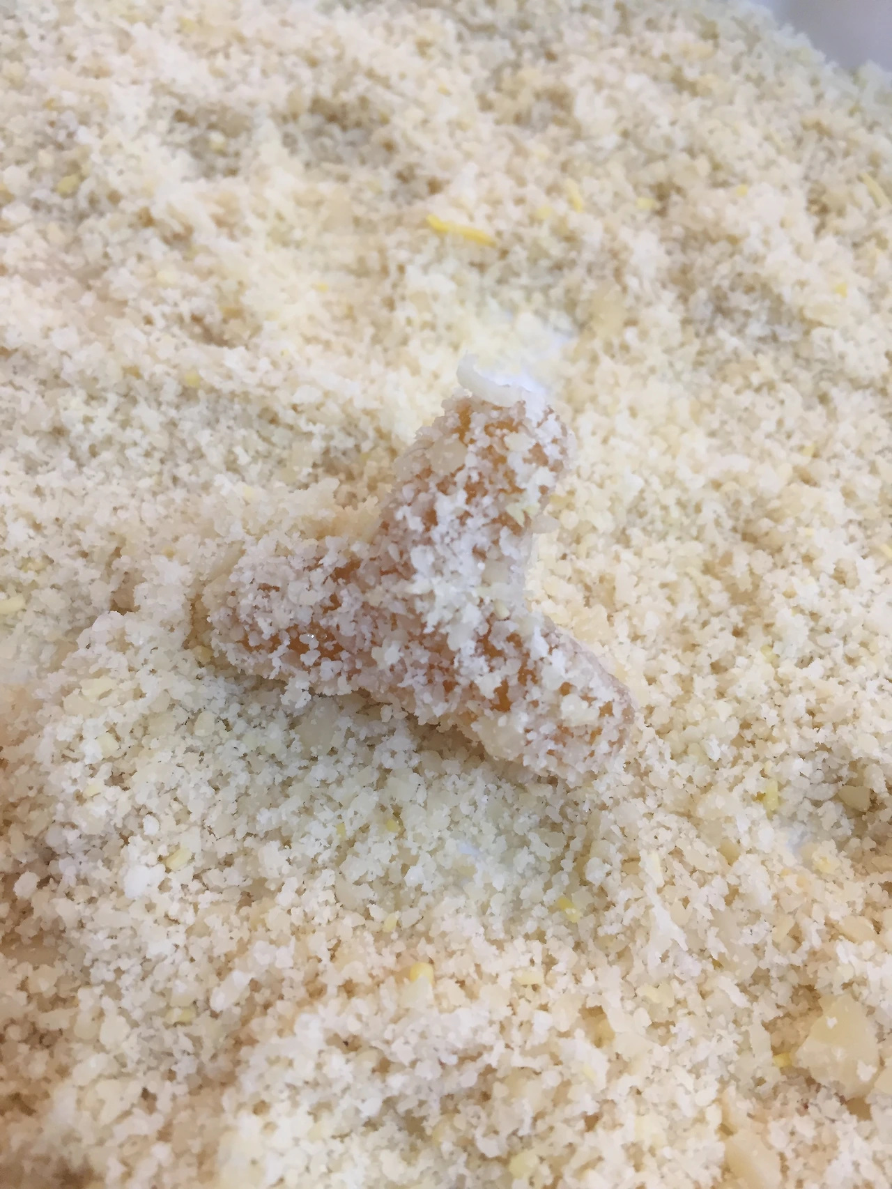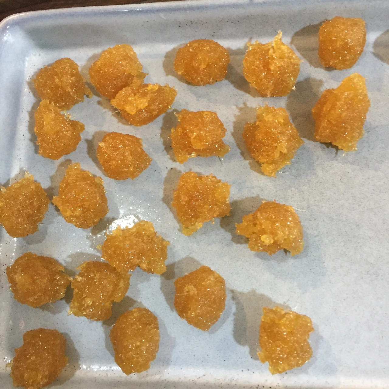 5. 한림 나가면 손에 설탕물(물:설탕=1:1)을 묻혀가며 5g 생강모양(세 뿔)을 만들어 잣가루에 굴린다.