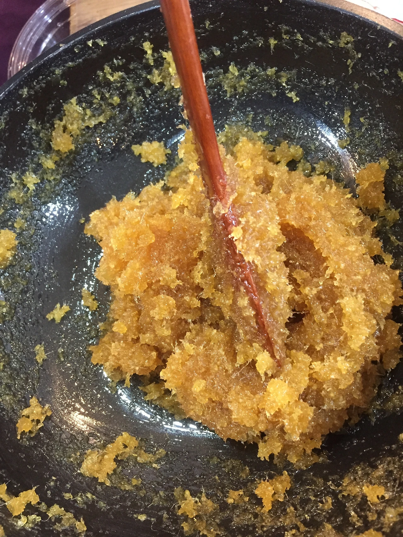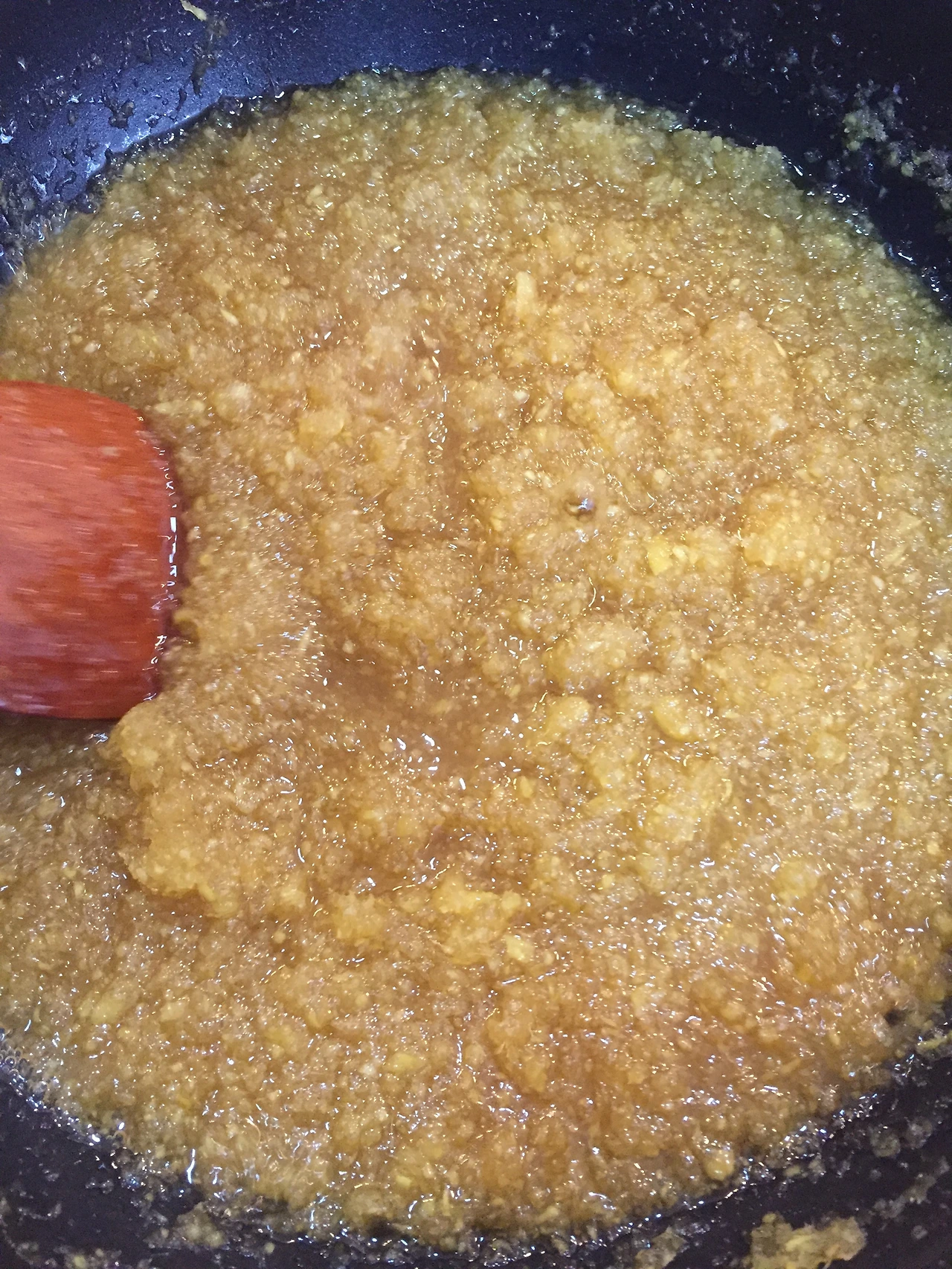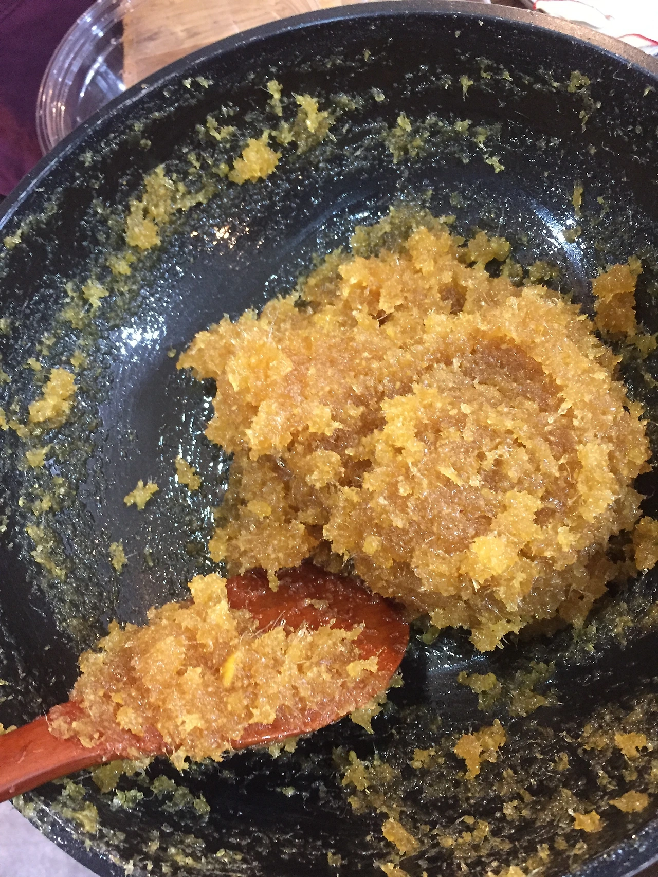 4. 생강, 조청, 꿀을 넣고 강불에 수분 날린 후 한덩어리가 될때까지 중약불에 졸인다.