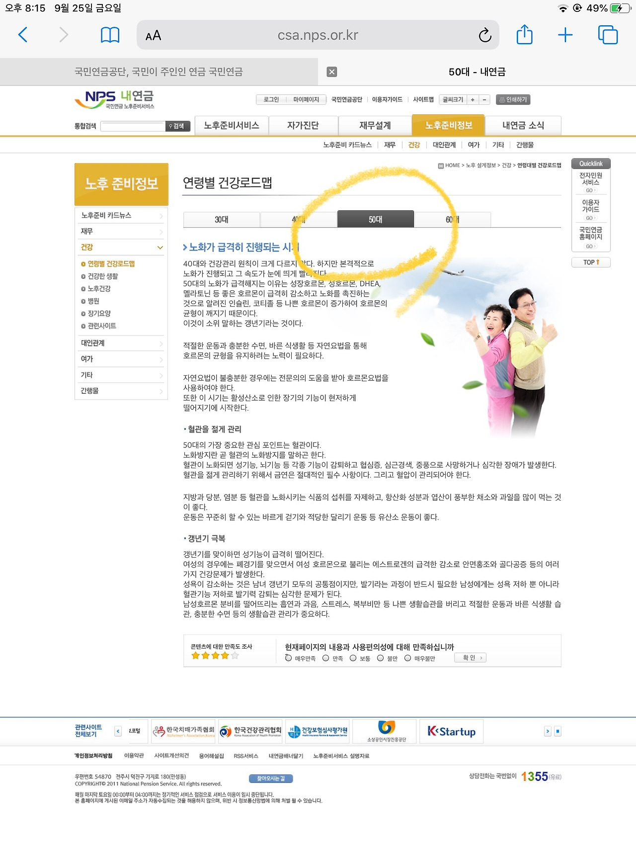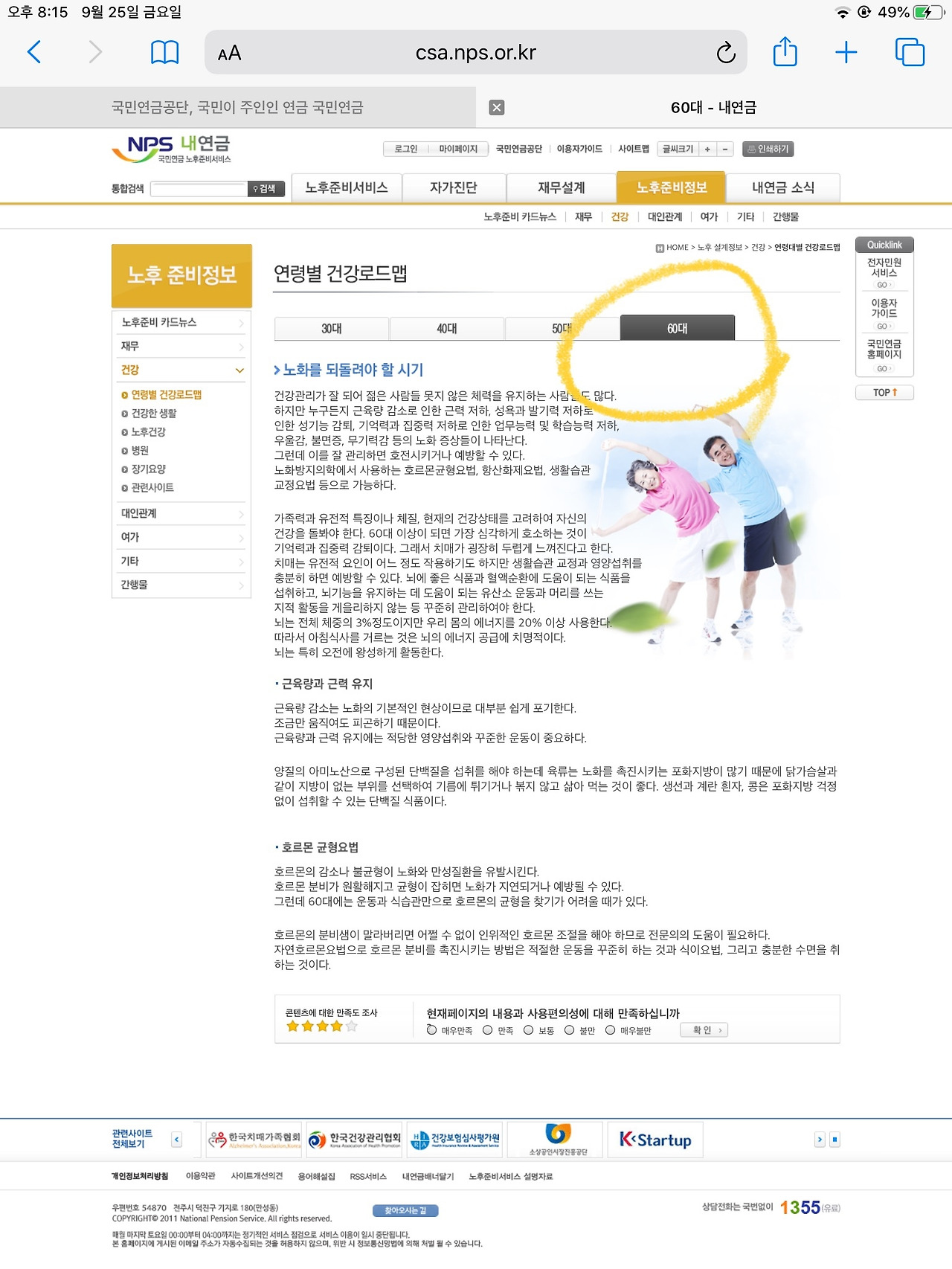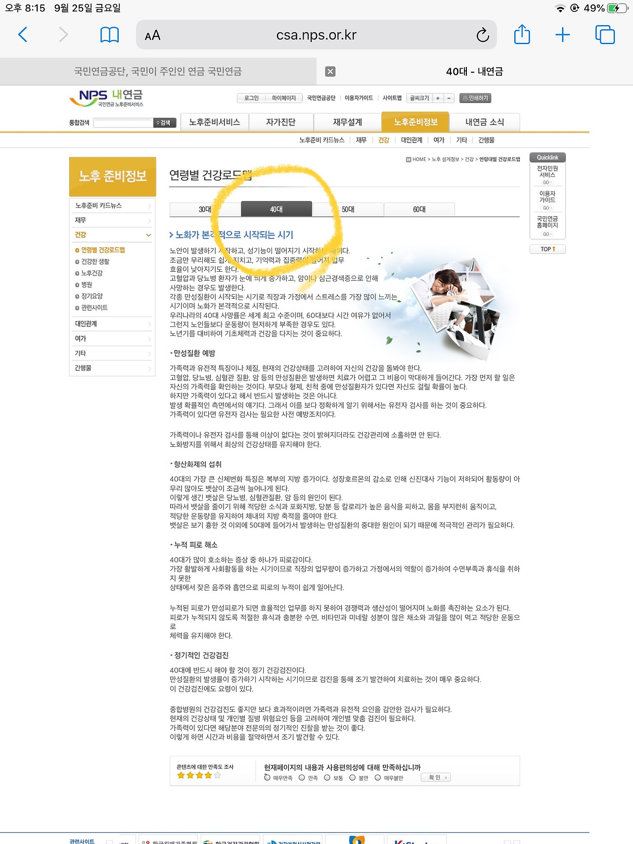건강을 클릭하자 30대, 40대, 50대, 60대 건강 가이드가 안내되어 있다. 70대부터 100세 혹은 그 이상의 연령대에 대한 가이드는 없다. 어딘가 검색하다 보면 도움될 가이드를 찾을 수 있으리라 기대한다.