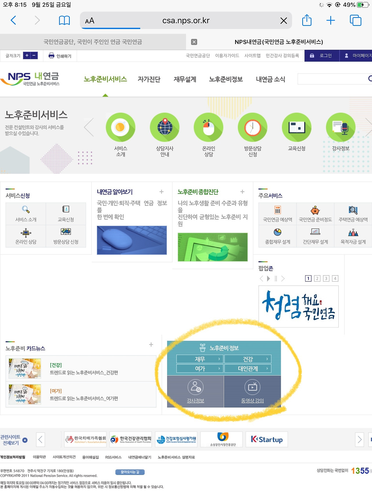 내연금(노후준비)를 클릭하자 “노후준비서비스” 화면이 보인다. 역시 오른쪽 아랫부분에 “노후준비 정보” 안내가 있다. 재무, 건강, 여가, 대인 관계 중 건강을 클릭했다.