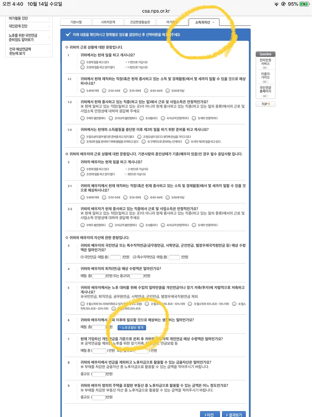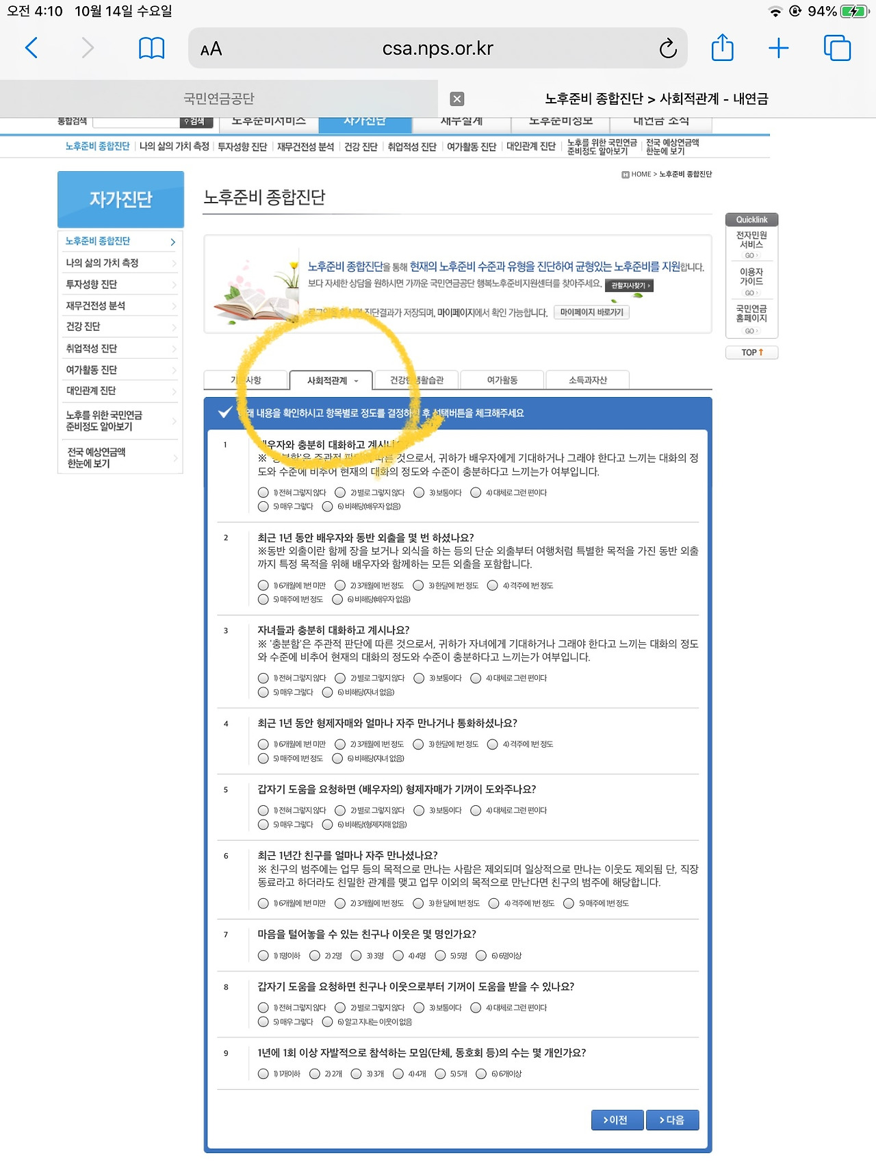 기본사항의 질문에따라 선택을 마치면 다음단계인 사회적관게 질문으로 이동한다. 같은 방법으로 소득과 자산까지 진행하면