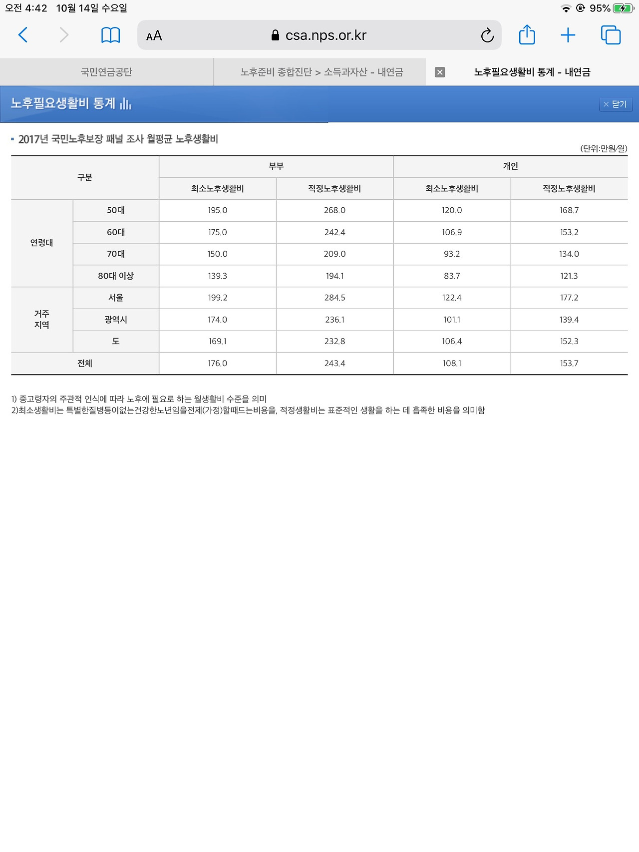 노후 생활비 통계는 2017년 통계로 연령별, 거주지역별로 구분되어 통계치를 알려주고 있다. 아마 이 통계는 조사 시기별로 자료가 업데이트되지 싶다.