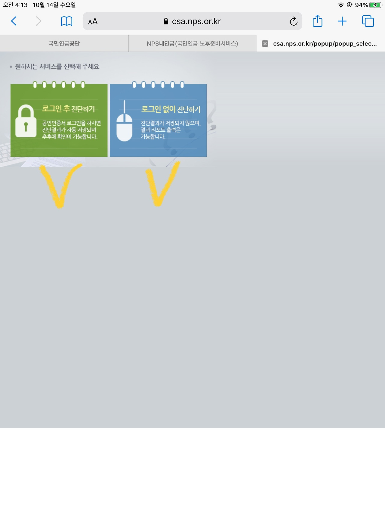“로그인 후 진단하기”를 선택하면 공인인증서나 카카오페이 로그인이 가능하다. 공인인증서나 카카오페이를 사용하지 않는 사람은 공인인증서 설치나 카카오페이 가입이 필수이다. 굳이 이런 구분을 둔 것은 이해가 가지 않는다 ㅠ.ㅠ