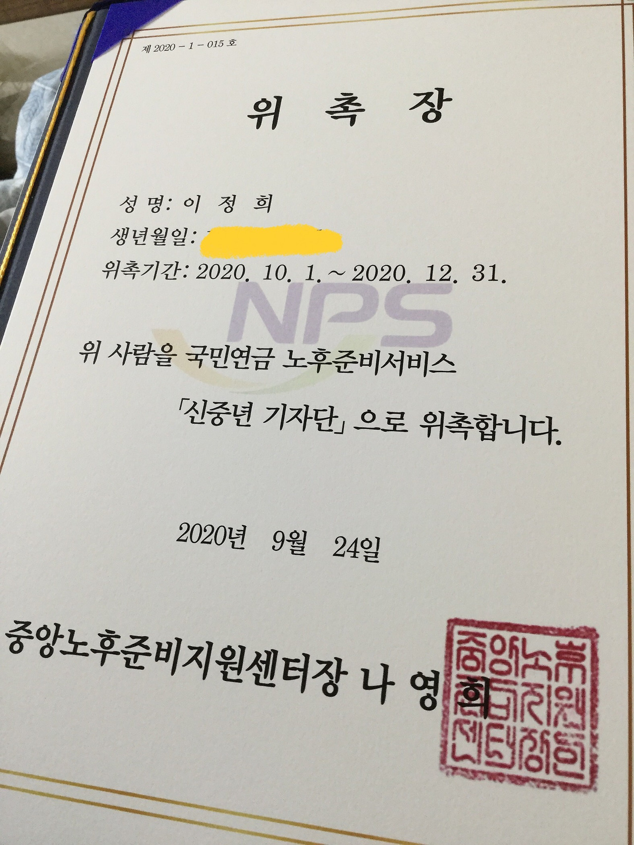 국민연금 노후준비서비스 [신중년 기자단] 신청을 했다. 수첩과 위촉장이 배송되어 왔다.