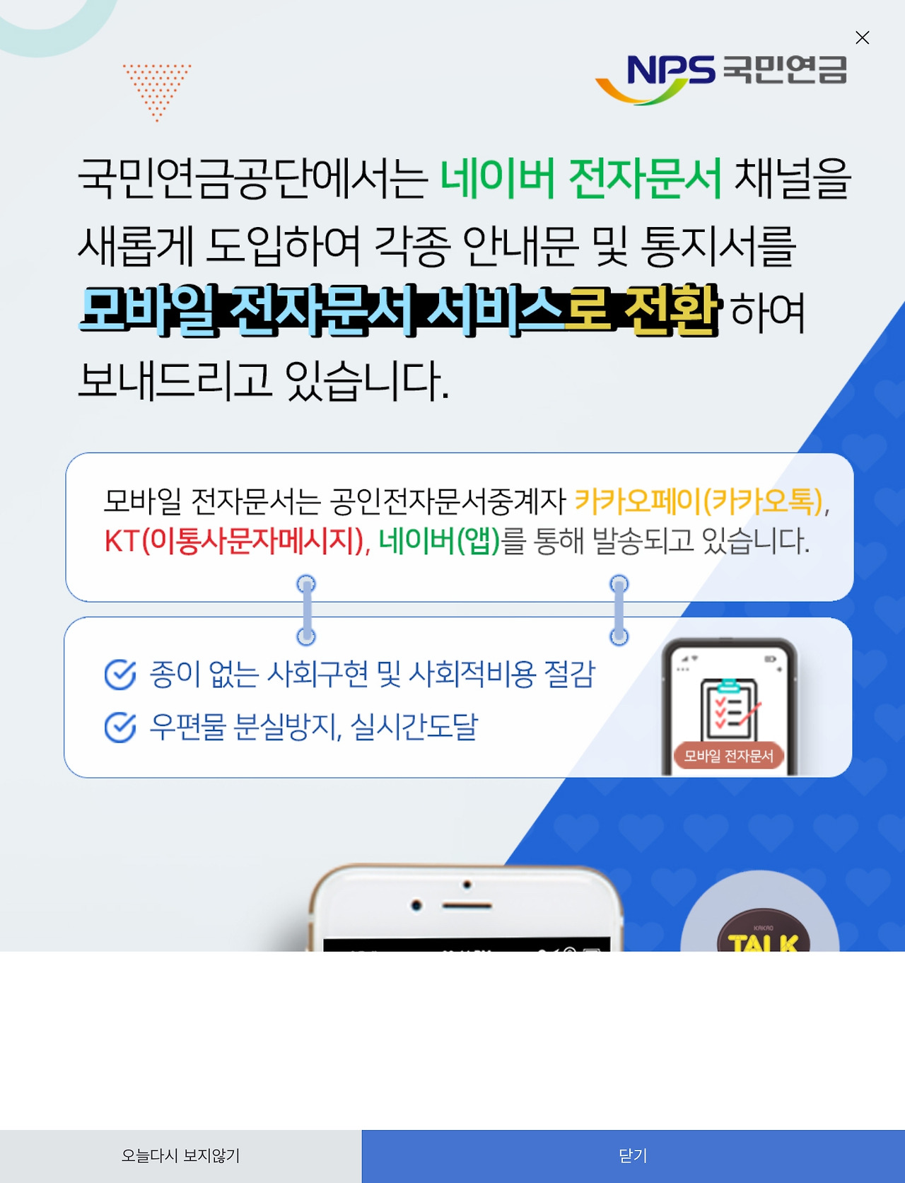 이런 팝업을 읽고나면 비로소 로그인 첫 화면이 뜬다. 개인정보인지라 팝업창에서 알리듯 공인인증서가 필요한 시스템이다. 공인인증서는 최근 공동인증서로 바뀌었다. 공동인증서(구 공인인증서)는 카카오페이로 대신할 수 있다. 내 경우는 카카오페이로 대신했다. 그래서일까? 알림 문자가 카카오톡으로 왔다. 메일로 알림 문자를 받을 수도 있다. 내가 원하는 메일, 카카오톡을 선택할 수 있다. 카카오톡으로 알림 문자를 받은 후 채널을 추가하거나, 차단할 수도 있다. 아래 링크를 보면 내 경우 국민연금 홈페이지 - 노후준비(내연금) 에서 제공하는 주택연금 정보와 개인 퇴직연금 정보 신청을 11월 23일 신청해서, 주택연금 정보는 11월 24일, 개인 퇴직연금 정보는 11월 26일 각각 조회 서비스, 확인이 승인되었다. 조회, 승인 후 로그인하면 조회가 가능해진다. 이 조회 서비스를 알게 된 후 가족들과 주변 지인들에게 먼저 알렸다. 이 글도 여러 지인들에게 링크할 예정이다.