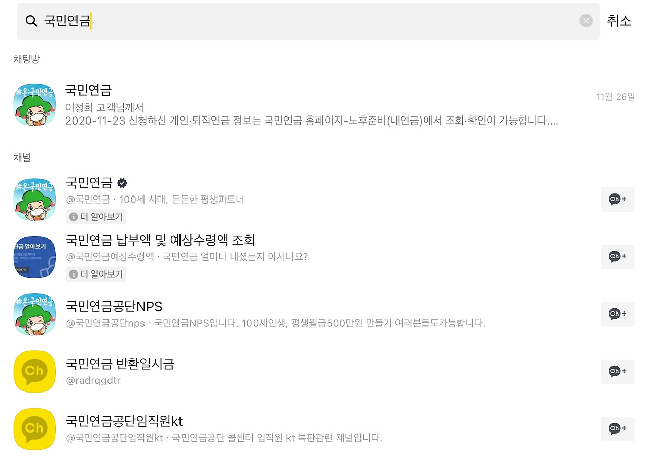 내친김에 카카오톡에서 “국민연금” 조회를 해봤다. 아래의 링크들이 카카오톡에서 검색되었다. 필요에 의해 톡을 실행할 수 있겠다.
