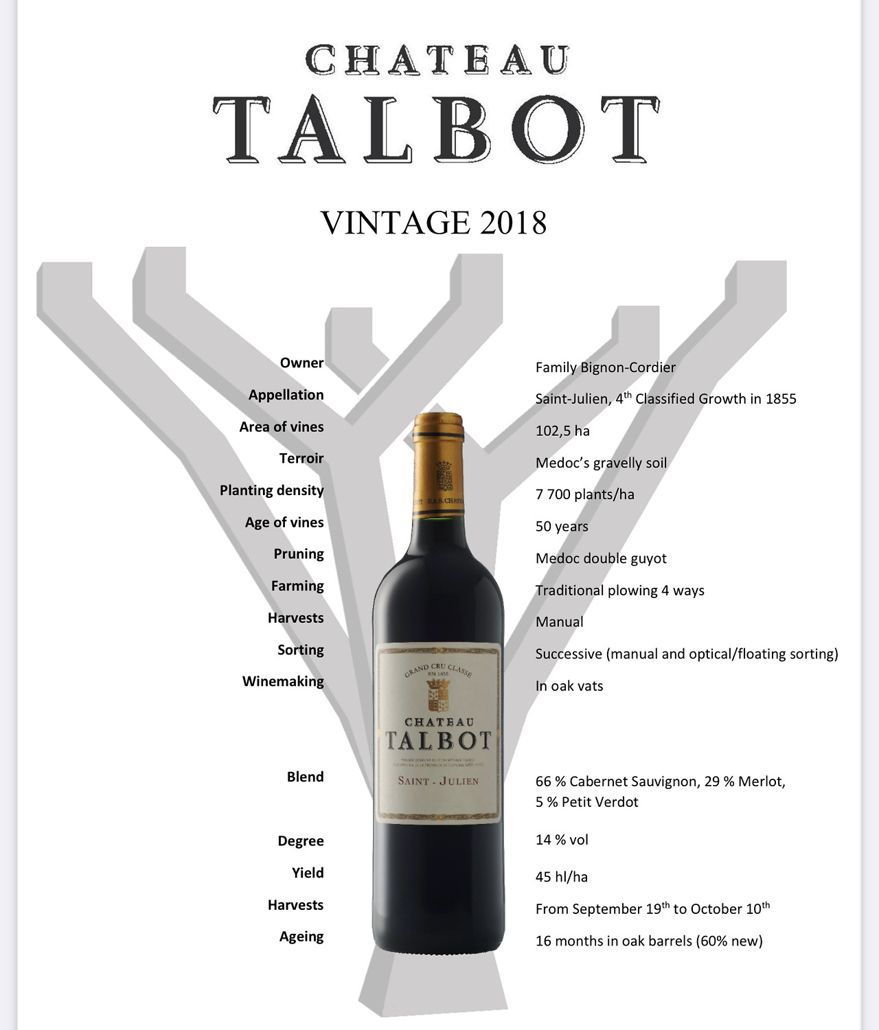 꼬르디에 가문의 샤또 인수 100주년 기념! 한정판 샤또 딸보 (Chateau Talbot) 2018 빈티지는 와인 전문가들의 평가가 역대급이고, 병 디자인도 특별하다.