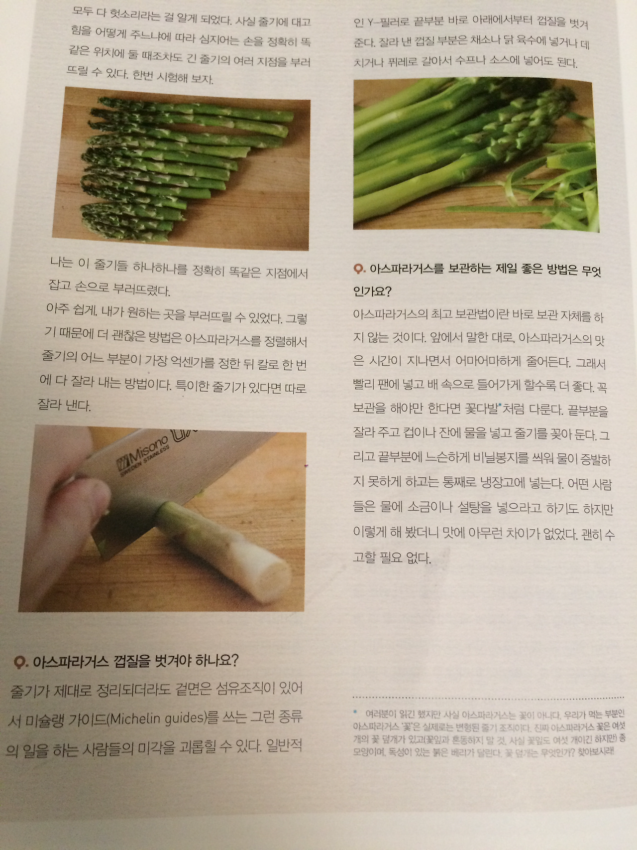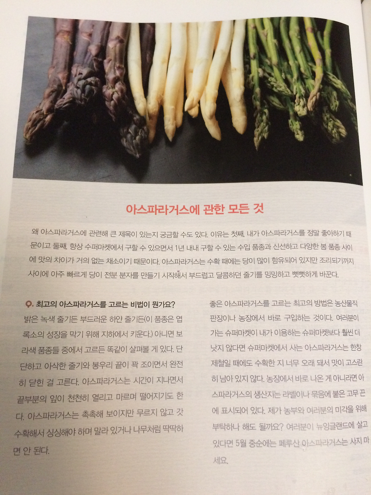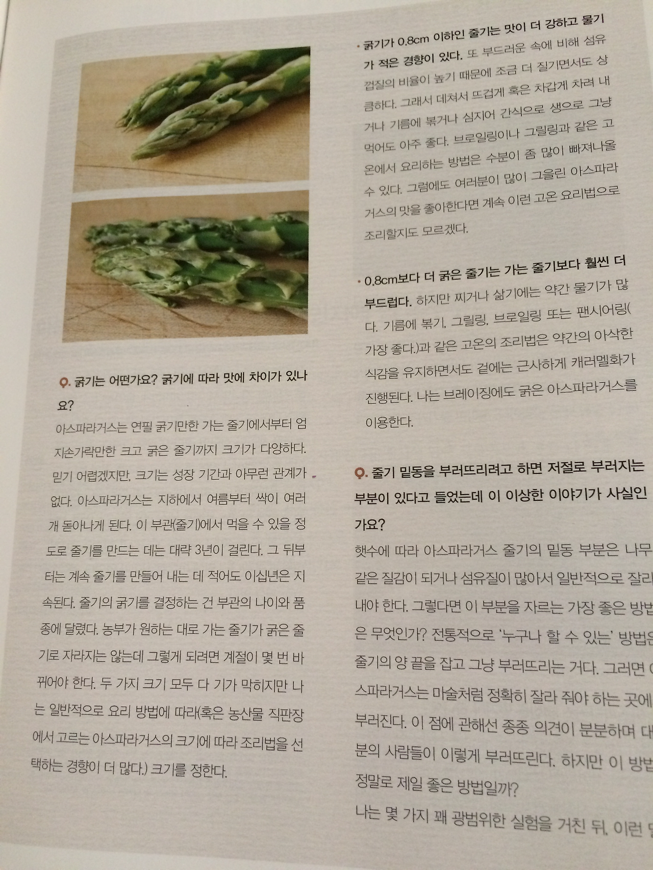 아스파라거스 고르는 법을 어찌나 가지런하게 잘 정리해 놓았는지 ... 이 책 저자의 수위에 감탄한다. 백문이 불여일견. 몇 페이지를 보자.