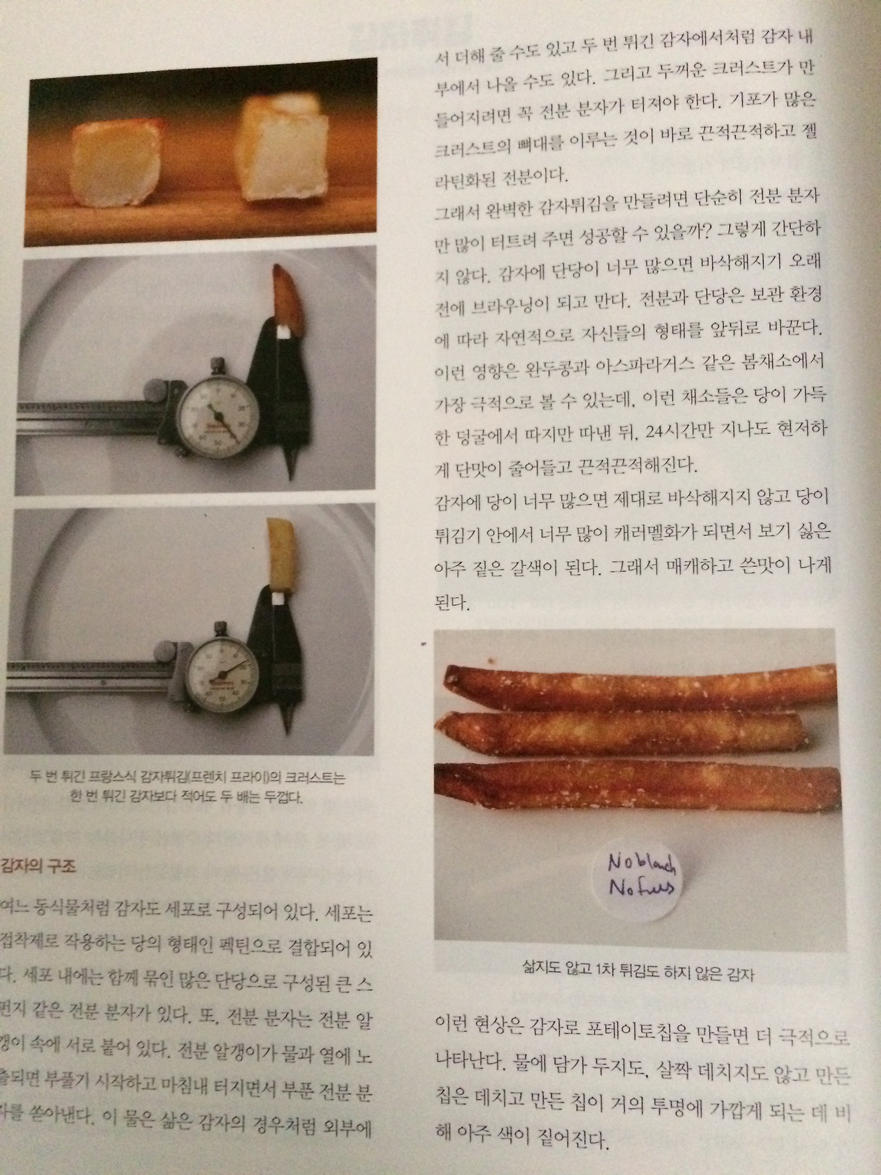 감자를 따라 읽다가 숨이 턱 막혔다. 감자 튀김에 왠 버니어캘리퍼스란 말인가? 이거 너무 현학적인거 아닌가? 살짝 경계가 들었다. 아 그런데 그게 ... 두 번 튀긴 감자 튀김의 크러스트가 한 번 튀긴 감자보다 두 배나 두꺼웠다는 저자의 실험 결과를 위해 동원된 것이었다. 감자 튀김에 버니어캘리퍼스라니 ... 상상과 기대 이상이다.
