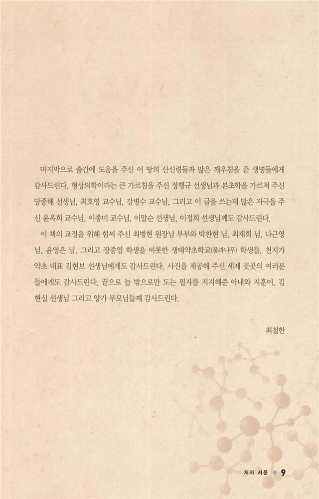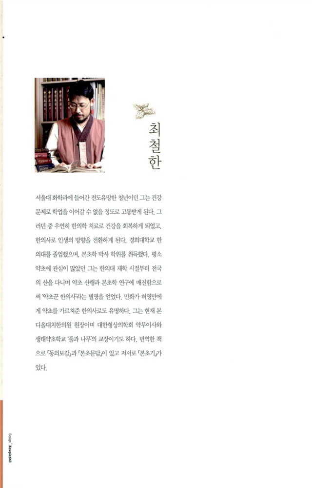 나는 저자와 함께 꼬박 1년동안 [동의보감]을 읽었다. 저자의 본초학은 더할 나위 없이 진지했다. 본초의 총체적 모습을 봄, 여름, 가을, 겨울에 따라 뿌리부터 줄기, 잎, 꽃과 열매까지 저자가 직접 찍은 사진으로 생생하게 보았다. 필요에 따라서는 중국(동의보감은 중국 의학서 100여권을 편집 정리한 위학서) 산야의 본초를 살펴 보기도 했다. 물론 저자가 직접 찍은 사진으로. 서문의 ' 이정희 선생님 ' 은 내가 맞다는 뜻이이기도 하다.