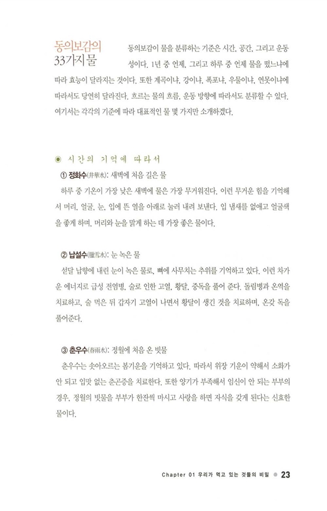 물로 시작해서 술을 지나 쌀에 이른다. 다음의 33가지 물을 따라 읽은 후에 나에게 맞는 물을 찾아보자.