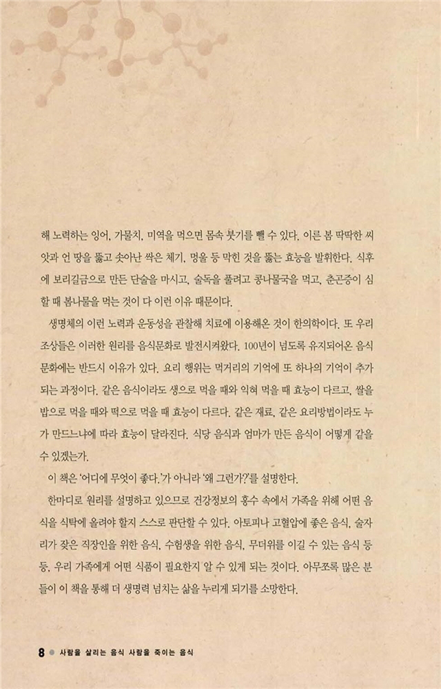 책은 마치 음식이 품고 있는 약성을 들여다 보는 돋보기 같다. 책을 따라 읽으면서 내 몸에 필요한 물, 술, 식료와 쌀을 찾아볼 수 있다. 찾는다면 오늘부터 당장 내 밥상 차림이 달라질 것이다.