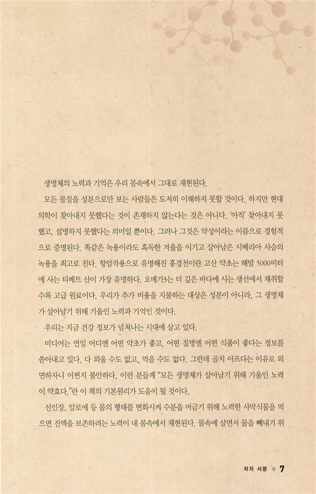 이 책은 [동의보감]을 발췌했거나, 요약 정리한 책이 아니다. 서브 타이틀에서 밝힌 것처럼 ' 동의보감과 천기누설에 없는 위대한 생태음식 이야기 ' 에 관한 책이다.