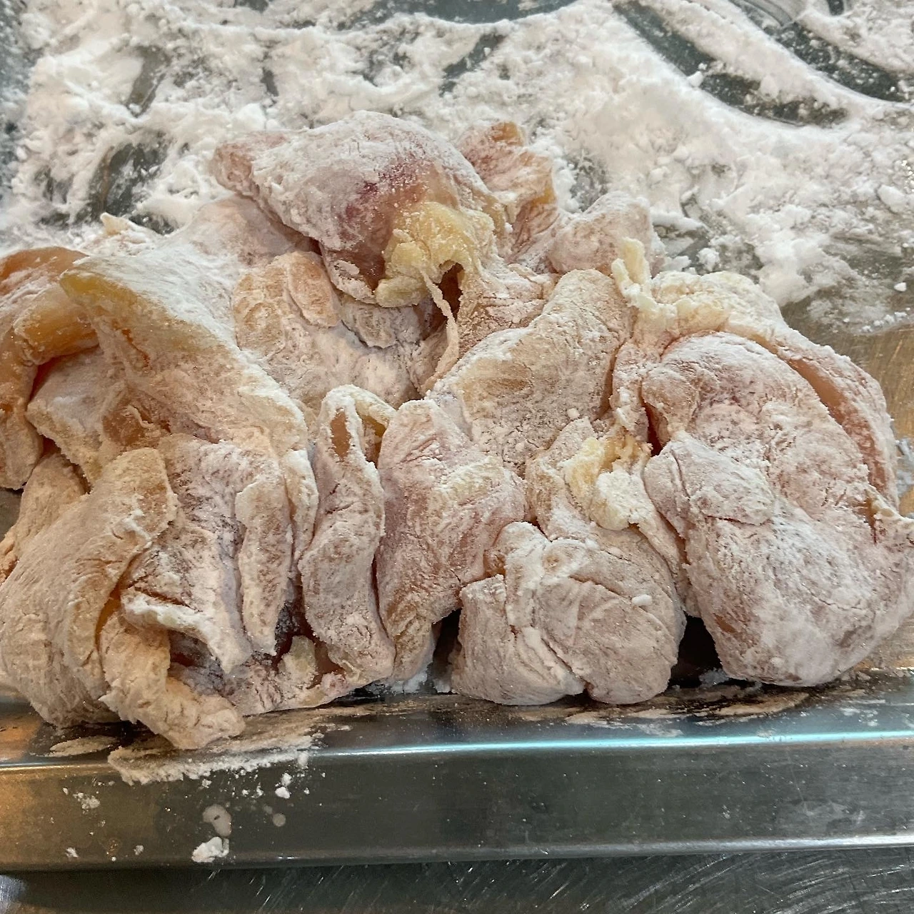 5. 녹말 묻힌 닭고기 한장씩 떨어지게 넣고 휘리릭