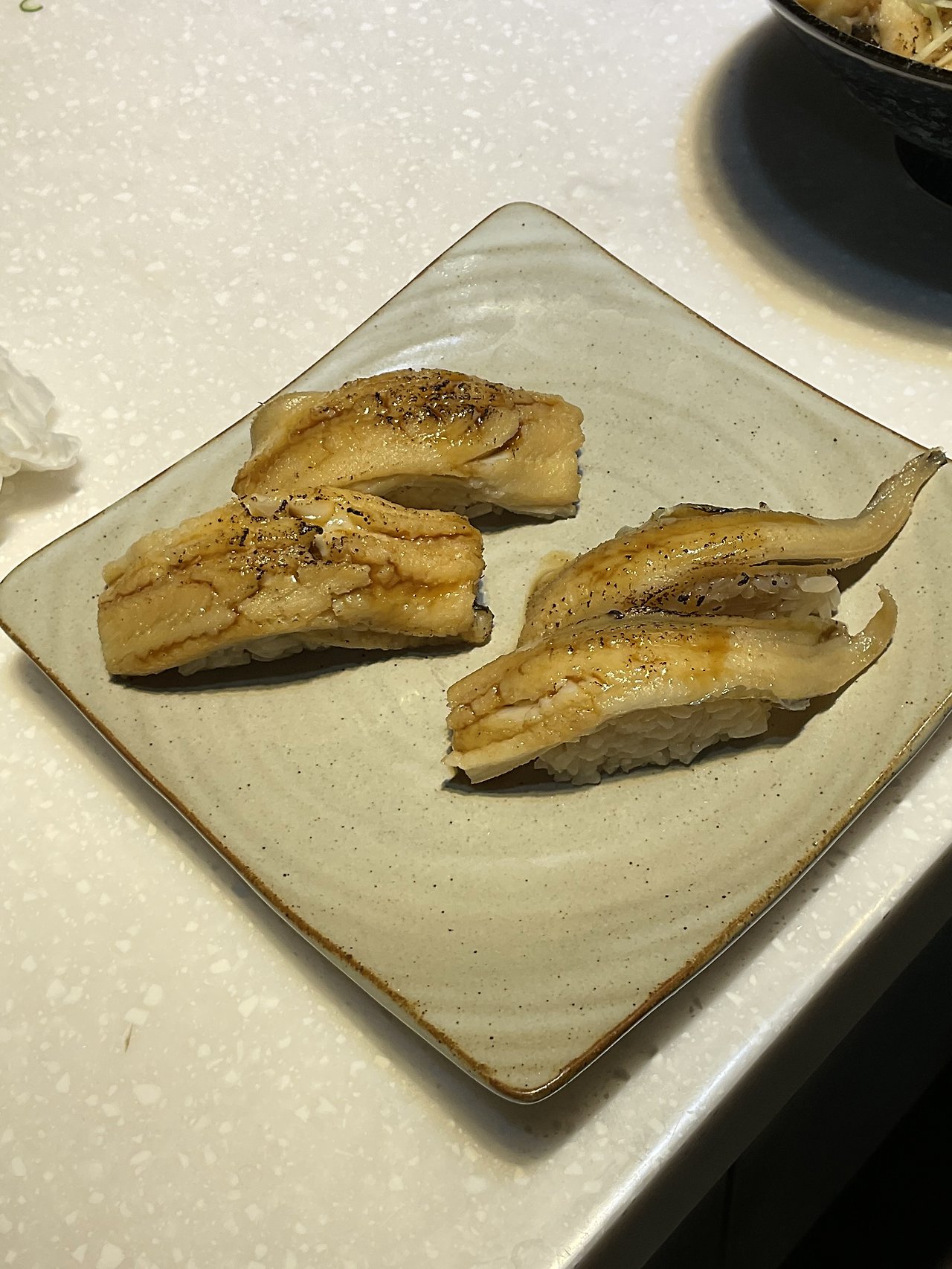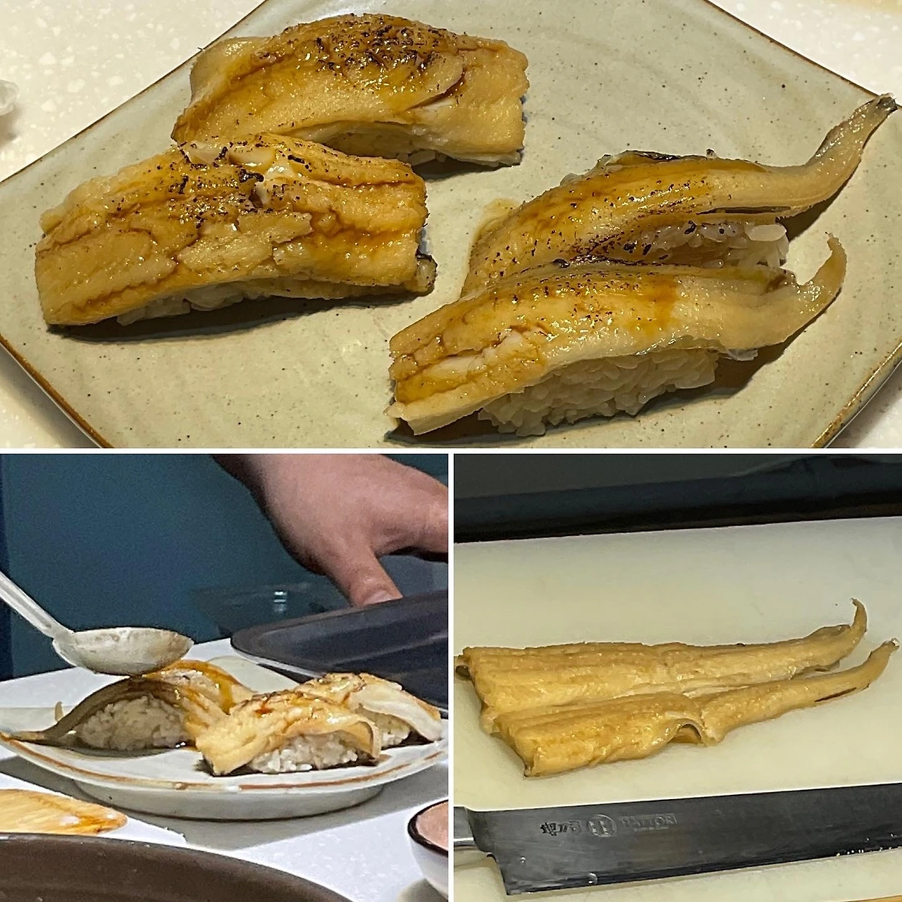 1. 물 500, 정종 100 끓으면 아나고(껍질이 아래로 향하게, 모양 그대로 유지, 한마리 통치한다 but 오늘은 반 잘라서), 거품 걷어내기(반드시)