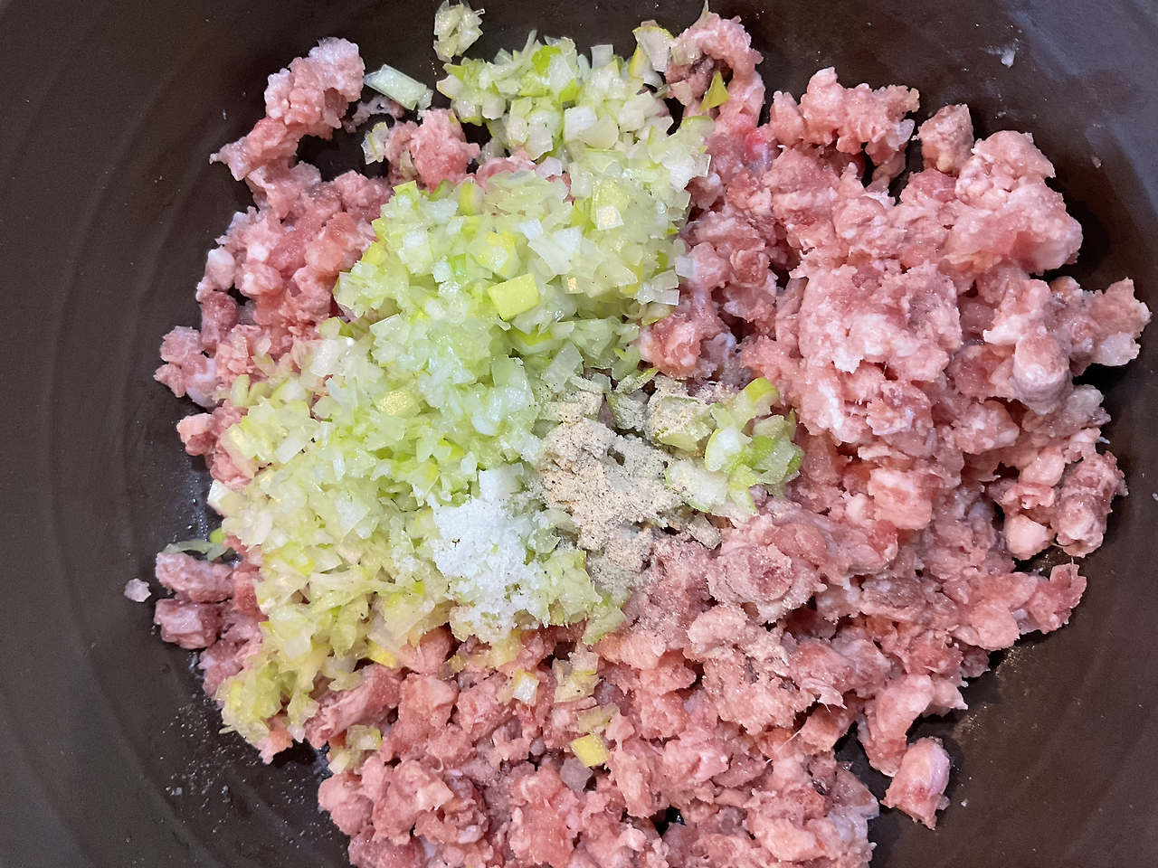 12. 10에 다진 파, 소금, 후추, 청주 1 넣어 치댄다. 아주 많이, 미트볼 만든다