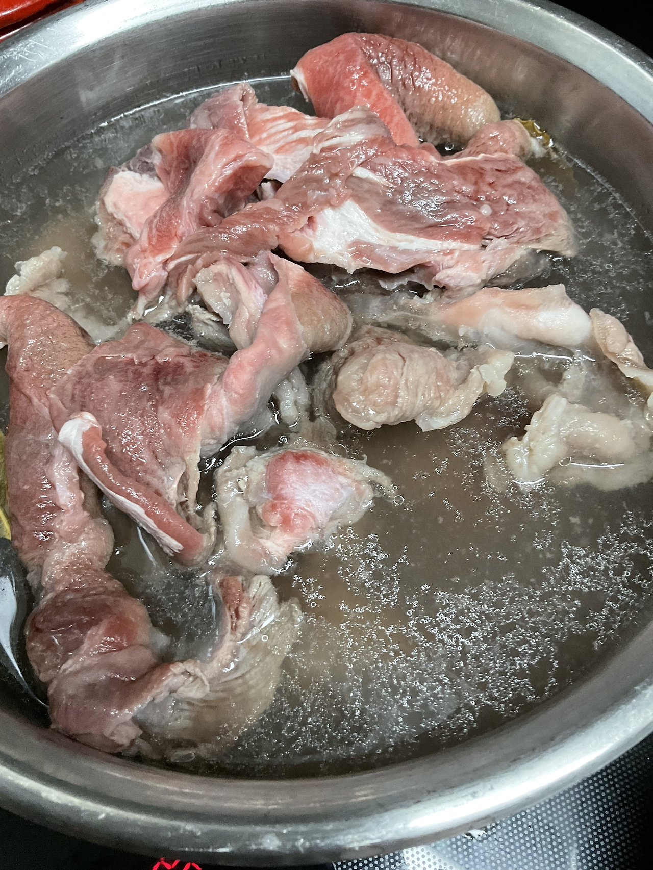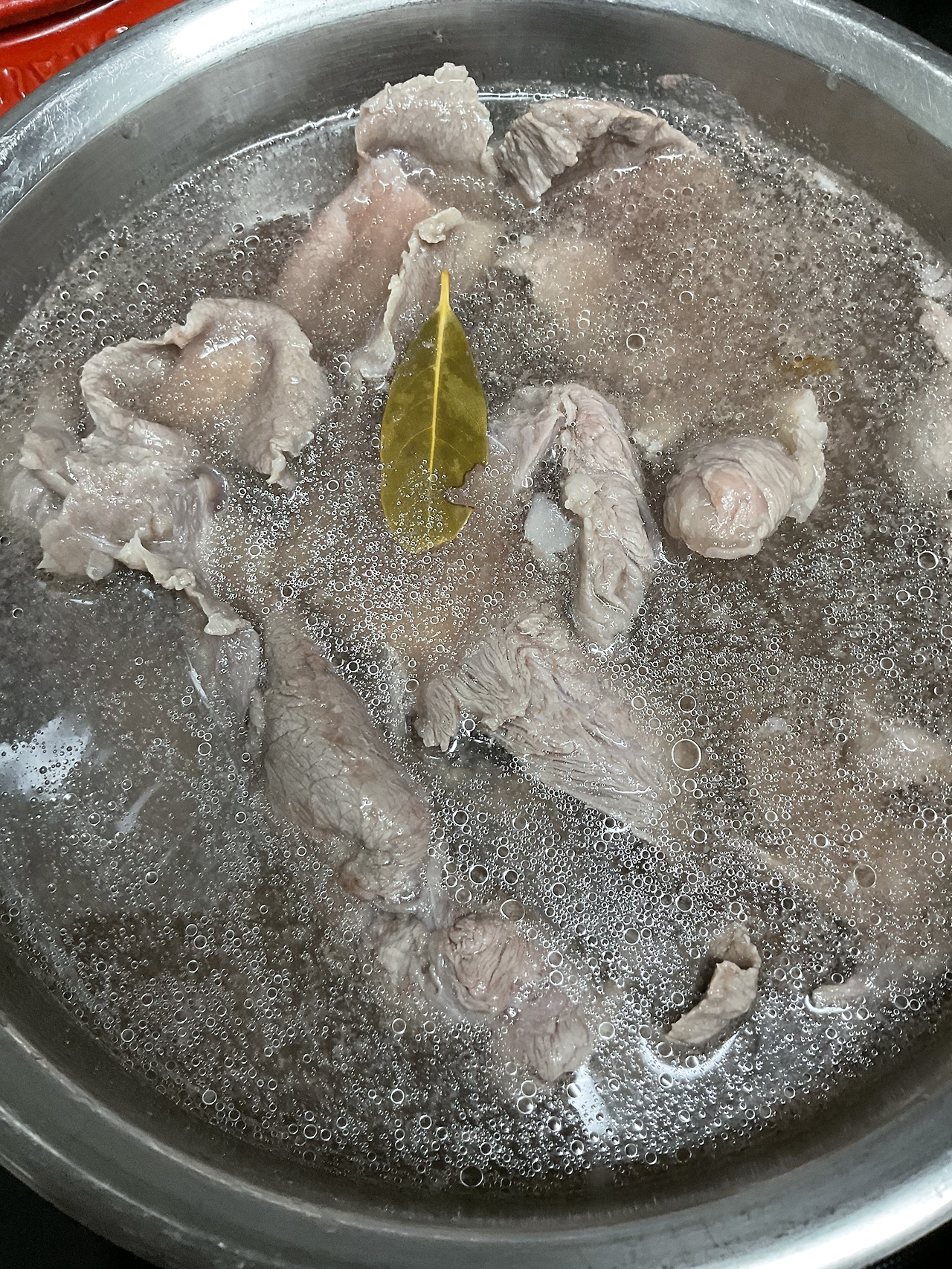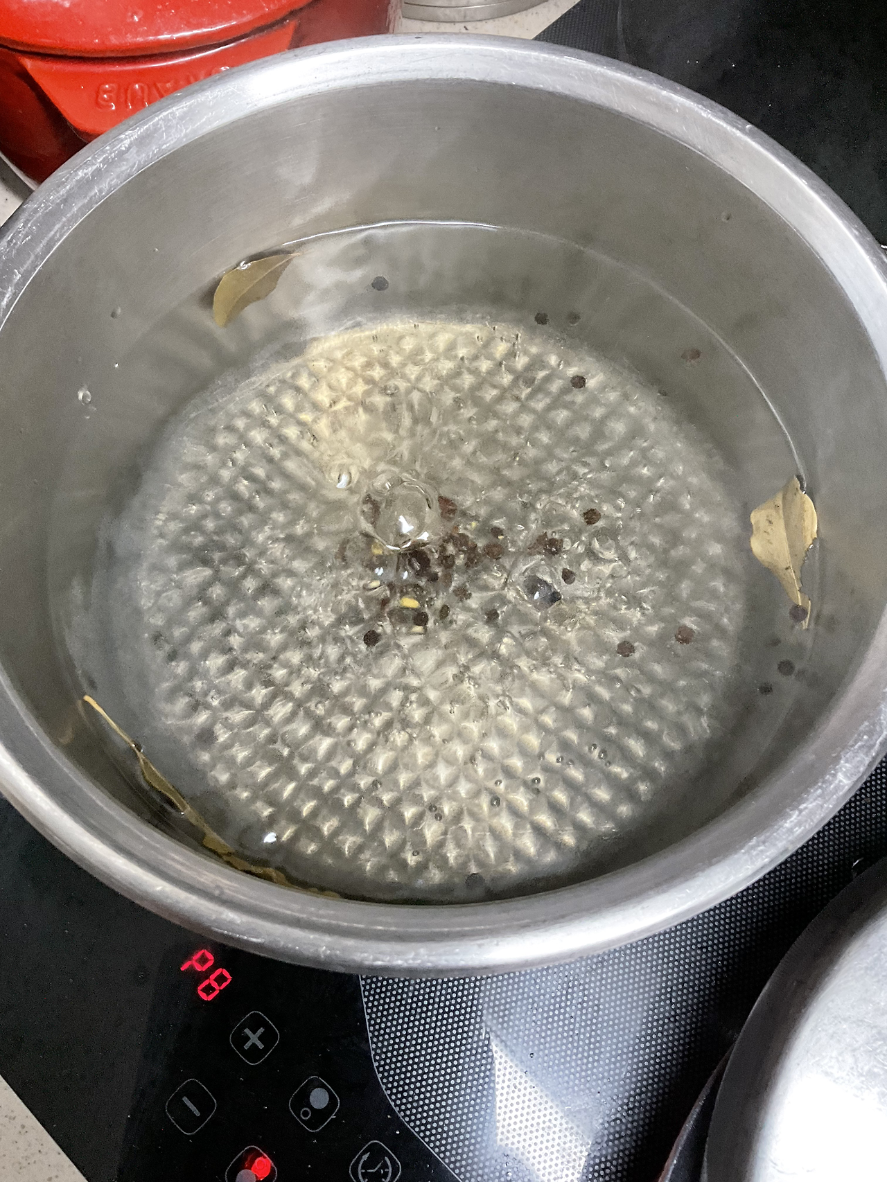 2. 물 3리터에 월계수잎 4장, 통후추 1Ts, 요리술 1cup 넣어 팔팔 끓인 후