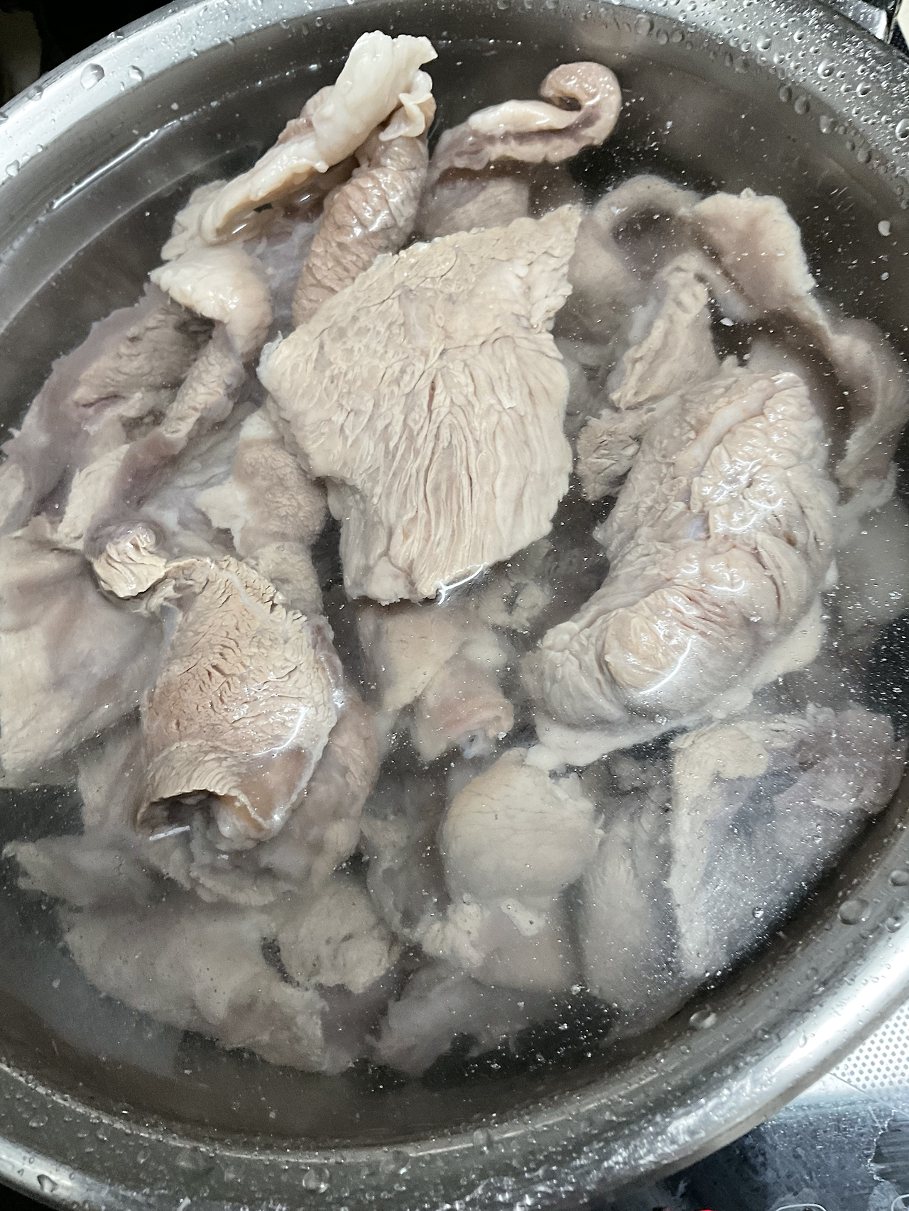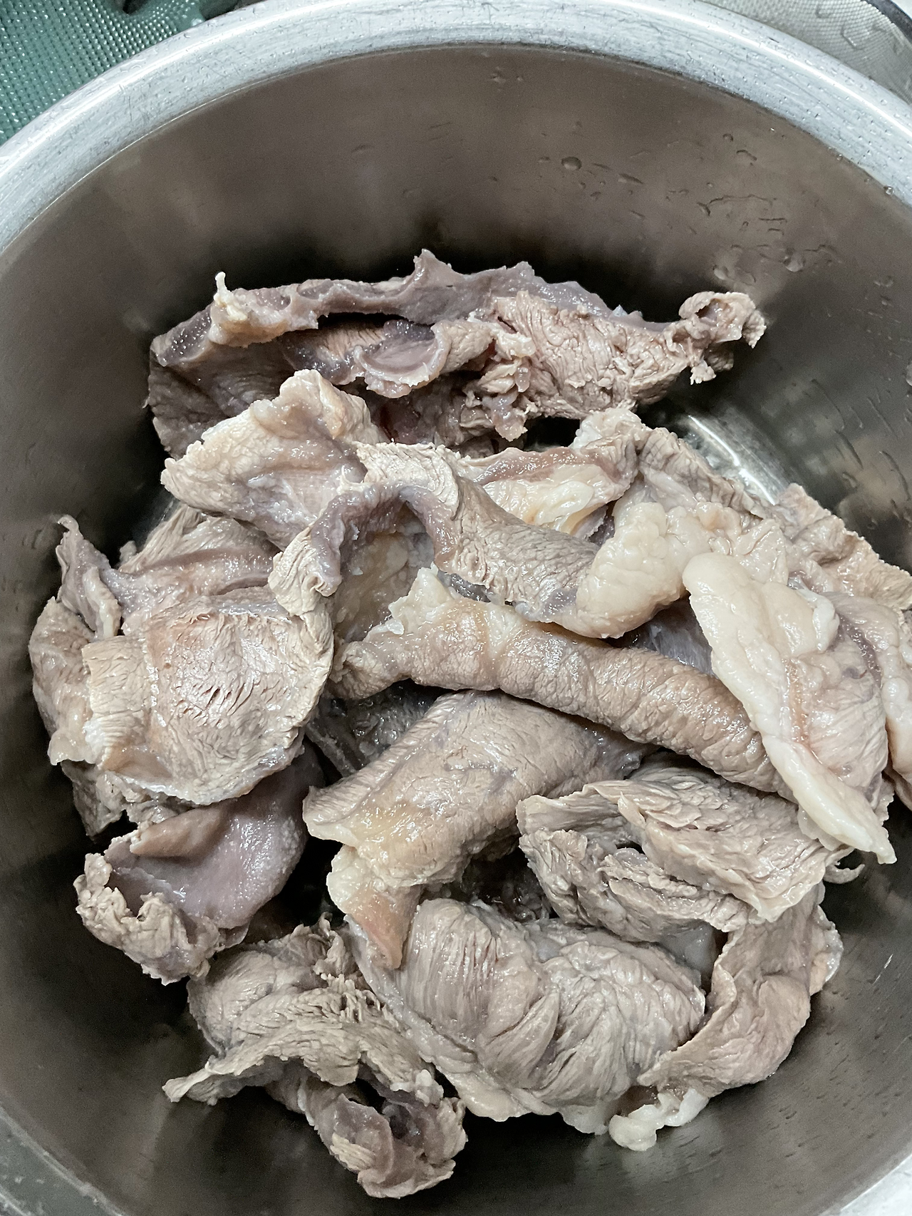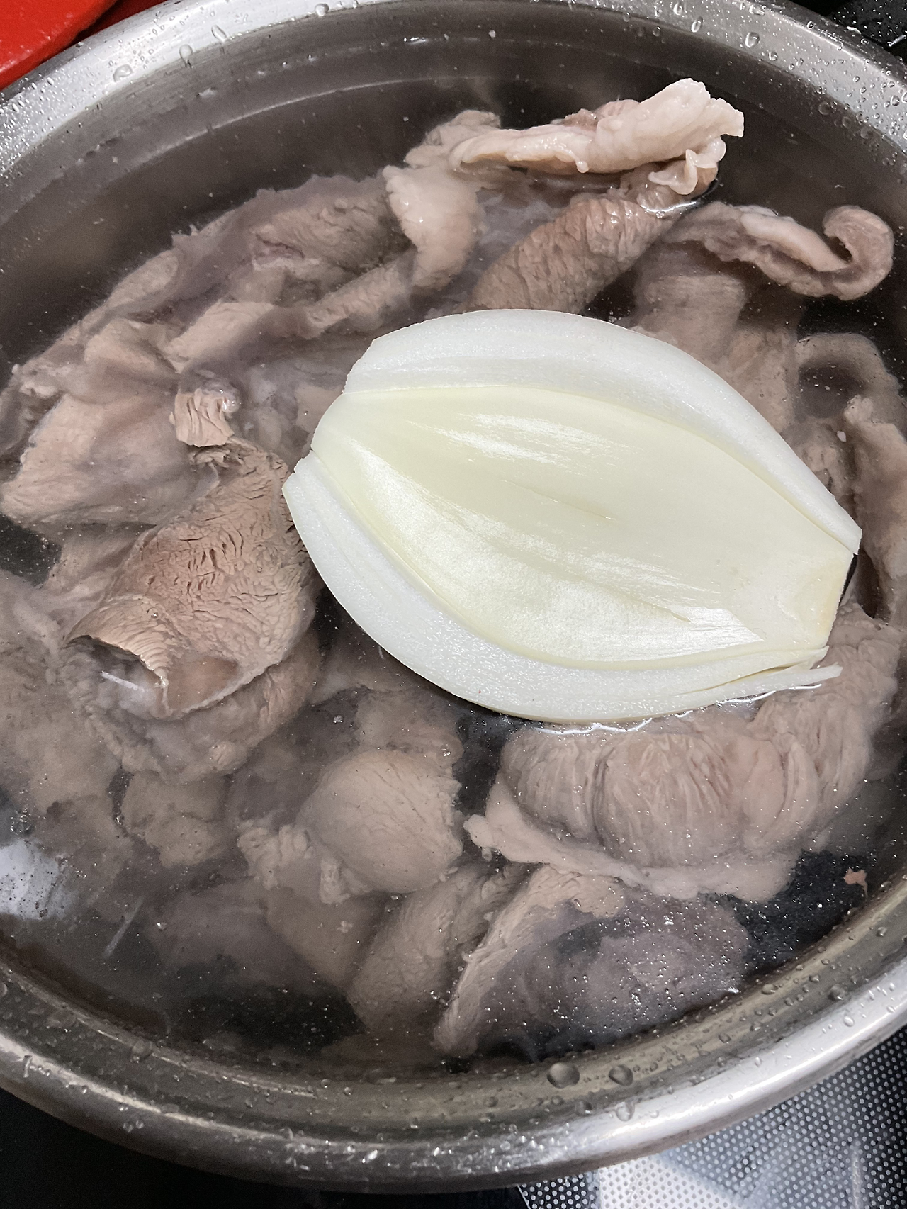 5. 냄비에 데친 스지, 양파 1/2개, 무우 1조각, 대파 1단 넣고, 물은 재료가 넉넉히 잠길 정도로 부어