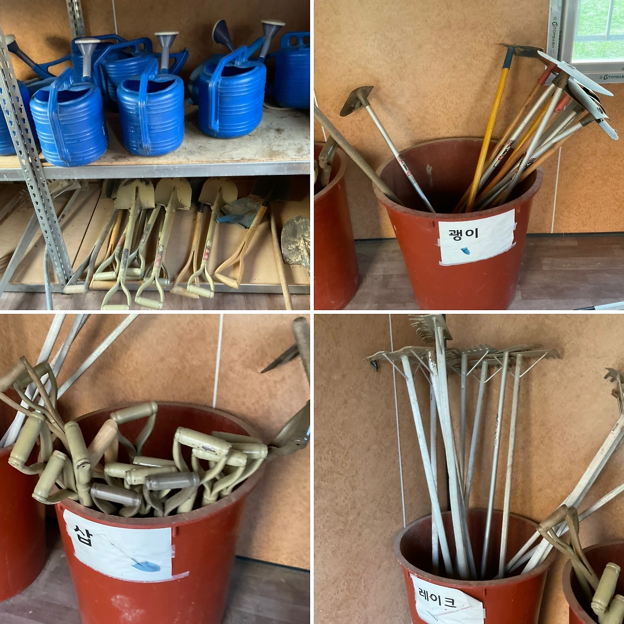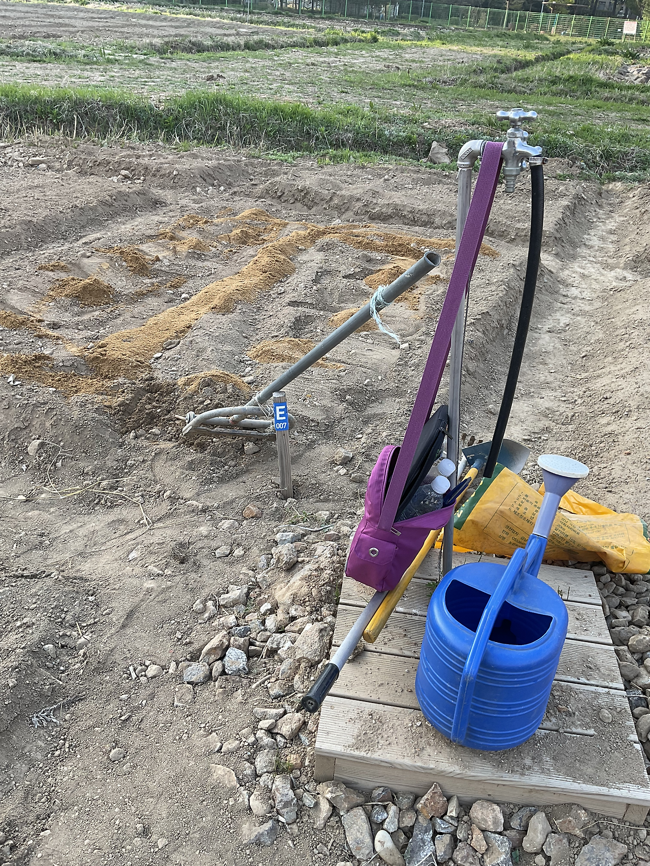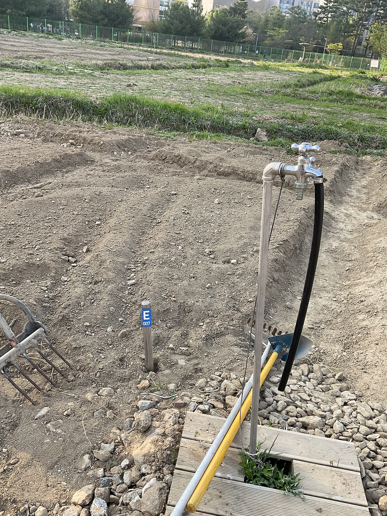 원두막 가깝고, 수도가 바로 팻말과 붙어 있다. 만세 호미 제외한 농기구와 조리도 공동 농기구 컨테이너에 비치되어 있다. 빠른 분들은 벌써 상추, 얼가리 모종을 심었더라.