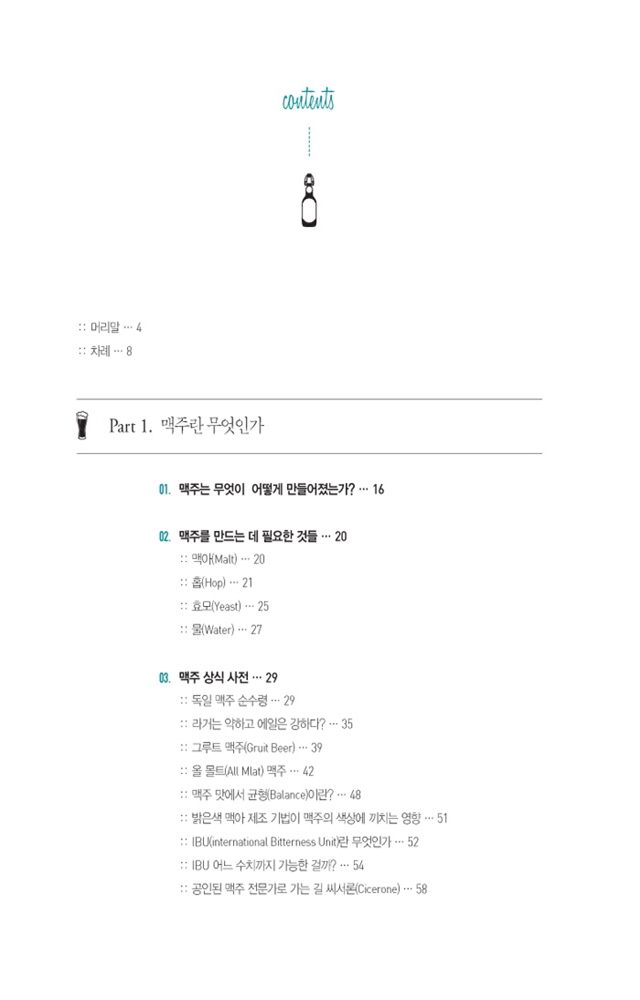 목차를 보다보니 ... 맥주를 만드는 요소, 상면발효, 하면발효, 크래프트에 이르기까지 참 꼼꼼히도 썼네 싶다. 발췌독이 아니라 처음부터 저자의 선택을 따라 읽기로 한다.