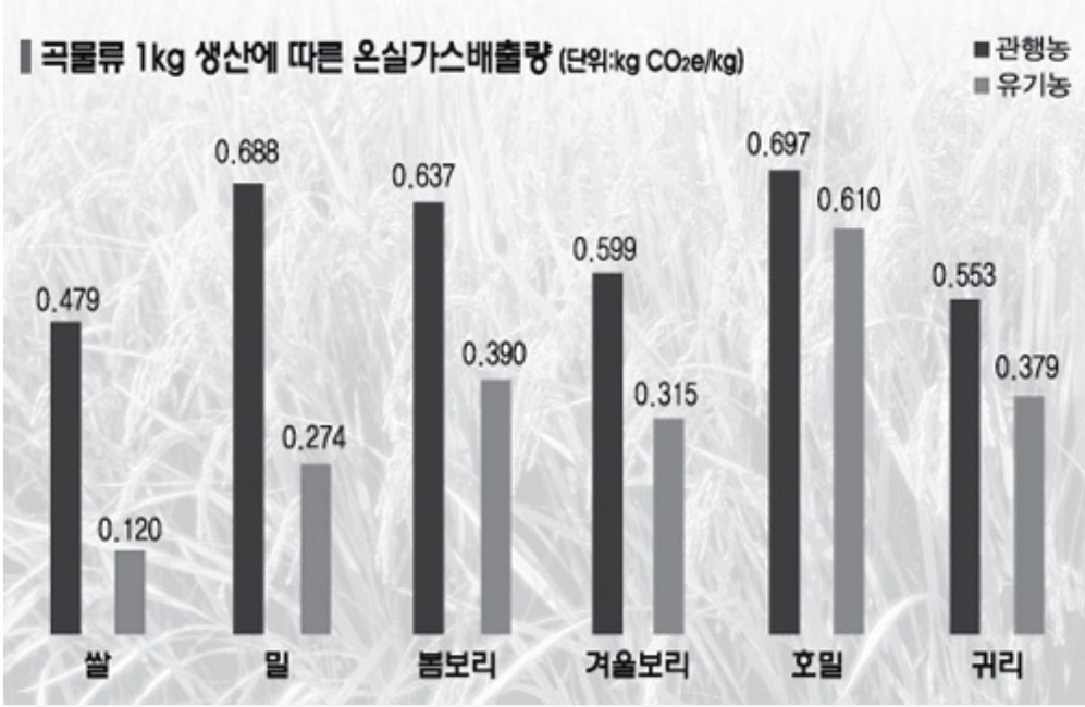 덴마크의 푸드 전과정평가(LCA)를 인용한 자료에 따르면 주요 곡물과 채소별 1㎏ 생산에 따른 온실가스(이산화탄소환산량) 발생량은 쌀의 경우 0.479㎏ 온실가스가 발생된다고 한다. 유기농 쌀의 경우 0.12㎏으로 관행재배 0.479㎏의 25% 수준이다. 유기농산물이 관행 농산물에 비해 화학비료와 농약사용을 줄임으로써 이들 제품의 생산이 유발하는 온실가스 회피효과가 높기 때문이다.
