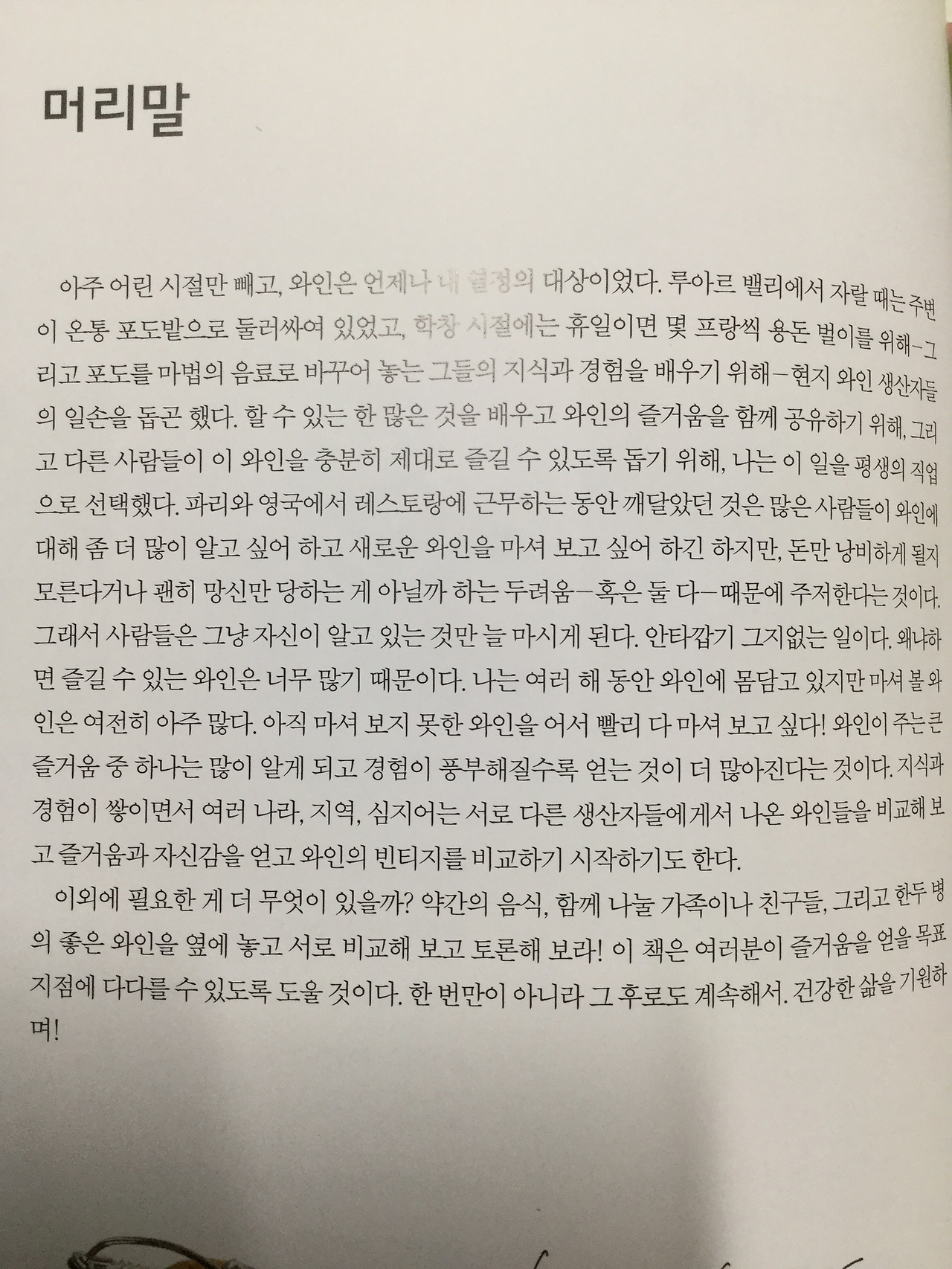 머리말 첫 문장은 이렇다. " 아주 어린 시절만 빼고, 와인은 언제나 내 열정의 대상이었다. " 성인이 되어 관련 일을 하면서 각색된 문장일 수도 있는 이 첫 문장이 그저 사실로 읽혀졌다. 심지어 몇 번이나 읽고 또 읽었다. 저자와의 첫 만남은 이 문장으로부터 시작되었다. 약간의 설레였음을 감출 수가 없다.
