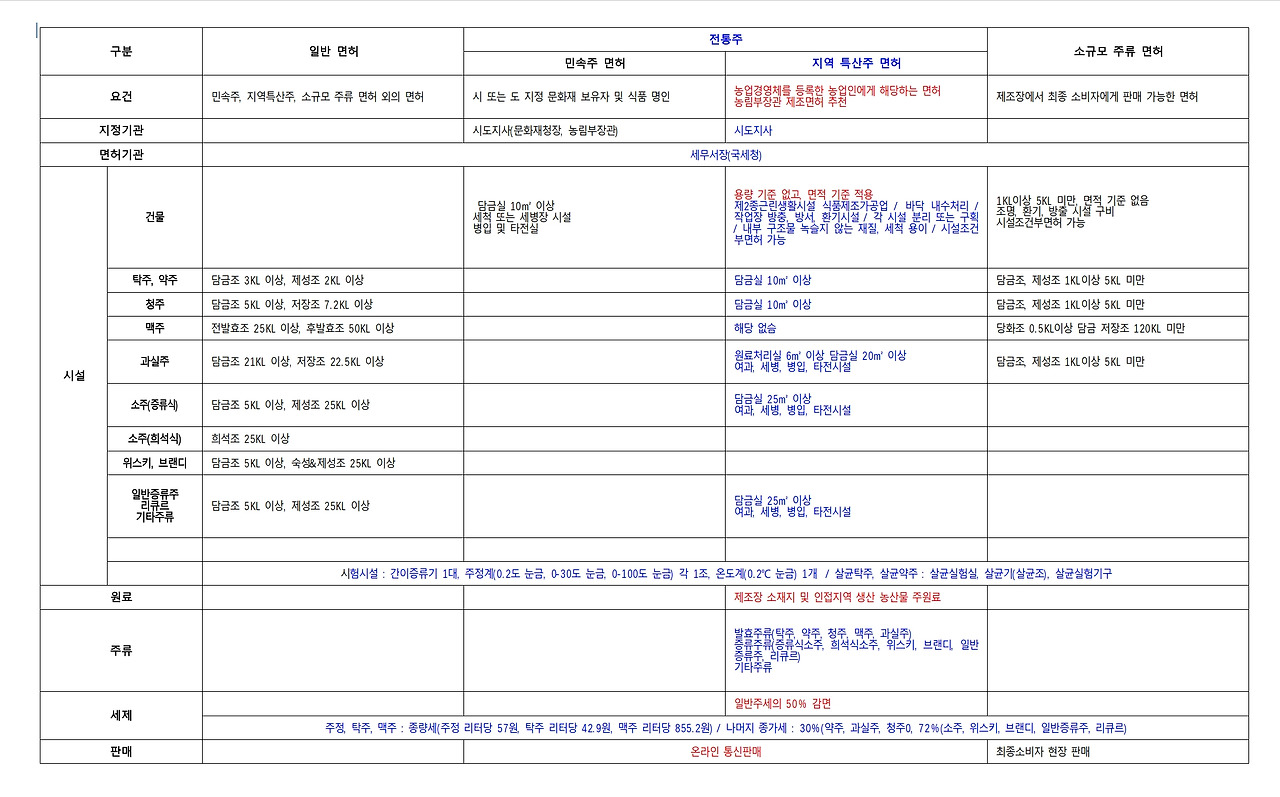 제 경우는 전통주 - 지역 특산주 면허에 해당합니다. 해서 제 해당 경우를 시준해서 비교 정리해두었습니다.