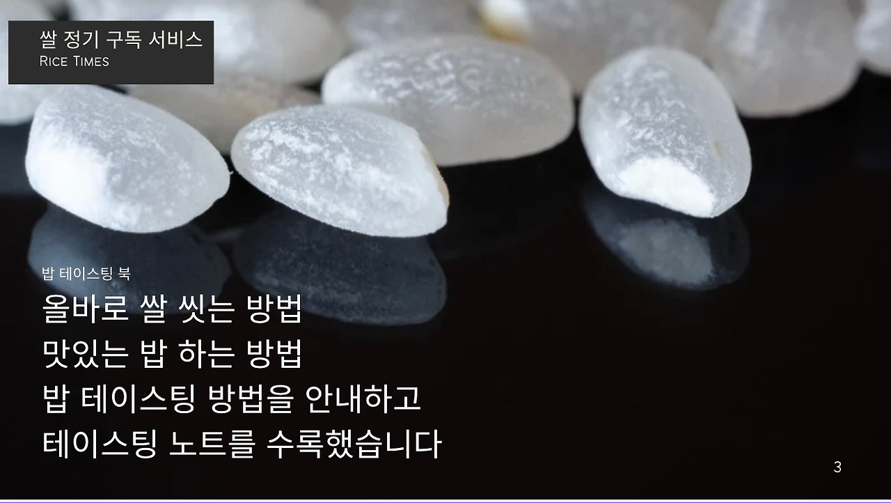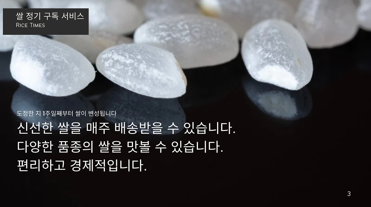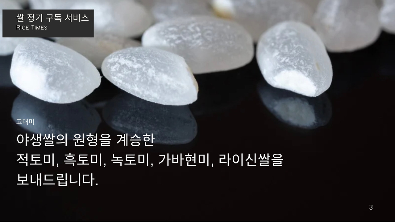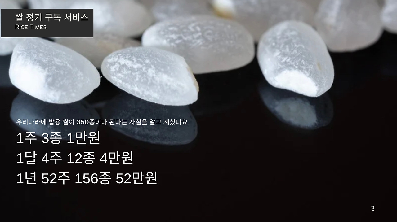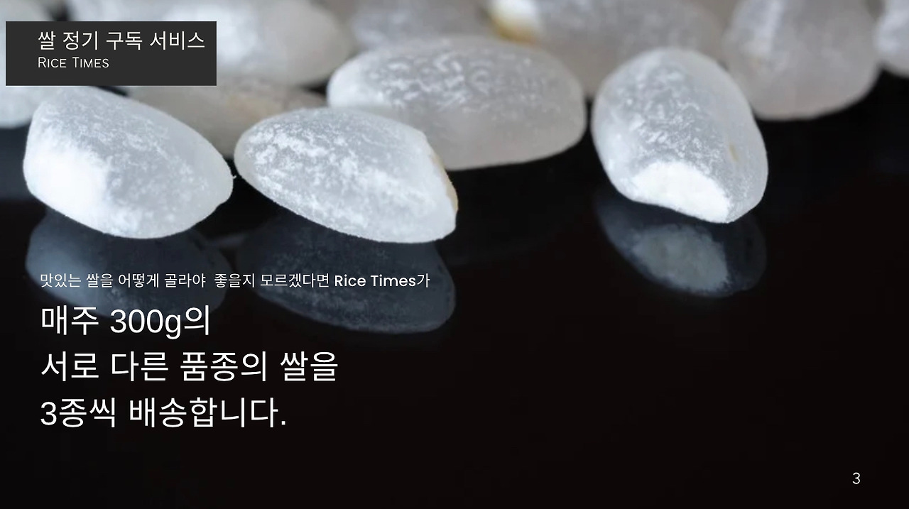 안녕하세요, [Makgeolli Times] 쌀 정기 구독 서비스입니다. 저희는 전국 각지의 특산 쌀을 엄선하여, 1주에 3종, 1년 52주 156종의 쌀을 보내드립니다. 각 지역의 특색을 살린 다양한 쌀을 맛보실 수 있으며, 도정한 특품 쌀만을 보내드리기 때문에 항상 신선하고 맛있는 쌀을 즐기실 수 있습니다. 또한, 저희는 쌀 정기 구독 서비스에 가입하시면, 다양한 혜택을 제공해드립니다. 밥 테이스팅 북, 밥용 생참기름, 동결건조 찐보리굴비, 쌀에 대한 정보 제공 등 다양한 혜택을 누리실 수 있습니다. 쌀 정기 구독 서비스에 관심이 있으시면, 지금 바로 가입하세요!