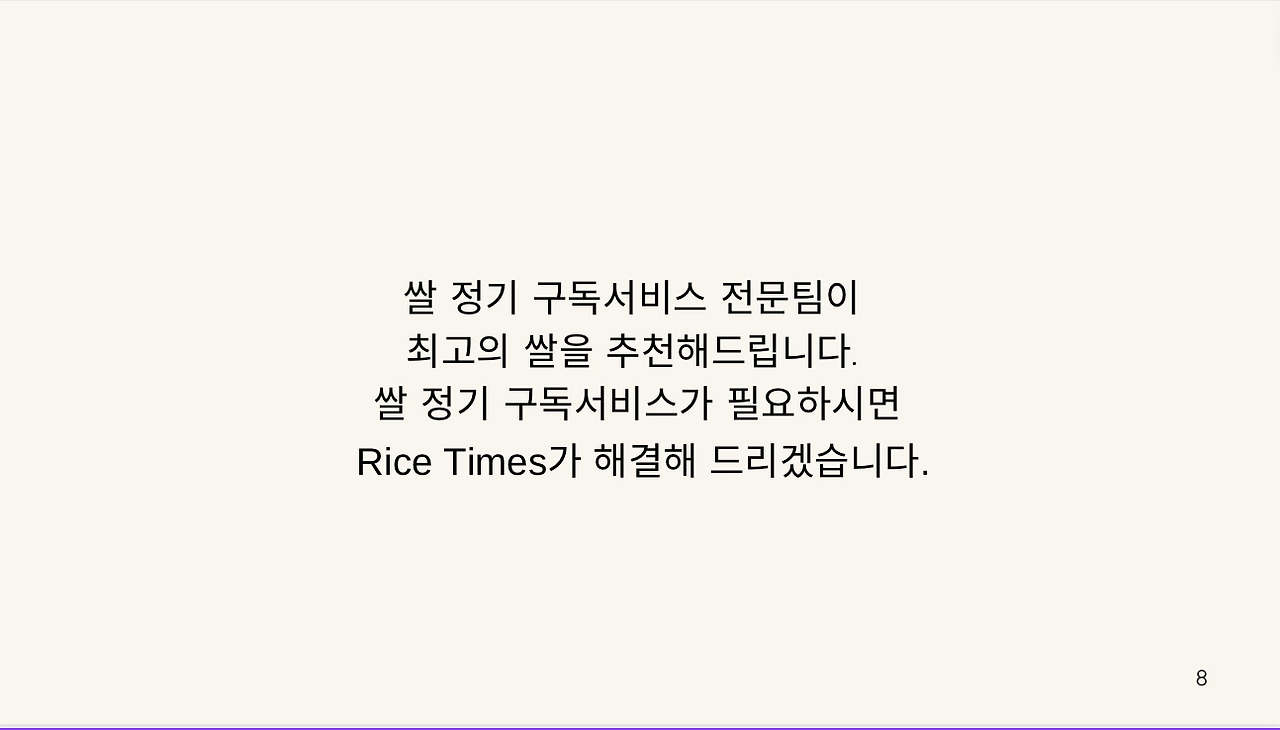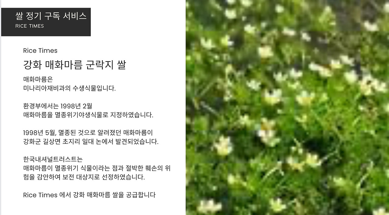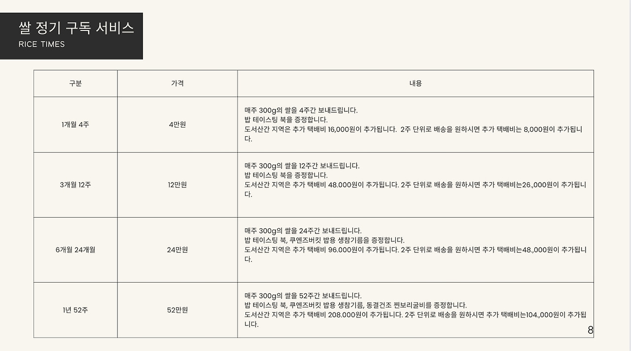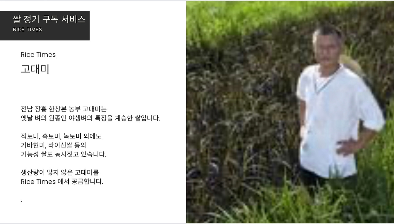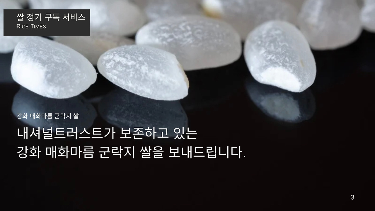 안녕하세요, [Makgeolli Times] 쌀 정기 구독 서비스입니다. 저희는 전국 각지의 특산 쌀을 엄선하여, 1주에 3종, 1년 52주 156종의 쌀을 보내드립니다. 각 지역의 특색을 살린 다양한 쌀을 맛보실 수 있으며, 도정한 특품 쌀만을 보내드리기 때문에 항상 신선하고 맛있는 쌀을 즐기실 수 있습니다. 또한, 저희는 쌀 정기 구독 서비스에 가입하시면, 다양한 혜택을 제공해드립니다. 밥 테이스팅 북, 밥용 생참기름, 동결건조 찐보리굴비, 쌀에 대한 정보 제공 등 다양한 혜택을 누리실 수 있습니다. 쌀 정기 구독 서비스에 관심이 있으시면, 지금 바로 가입하세요!