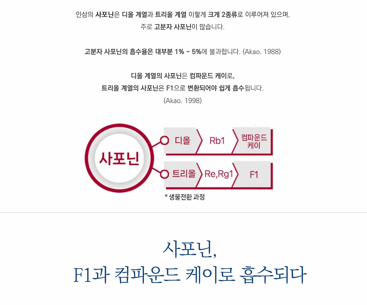 고분자 사포닌의 흡수율은 대부분 1% ~ 5%에 불과합니다. 디올 계열의 사포닌은 컴파운드 케이로, 트리올 계열의 사포닌은 F1으로 변환되어야 쉽게 흡수됩니다.