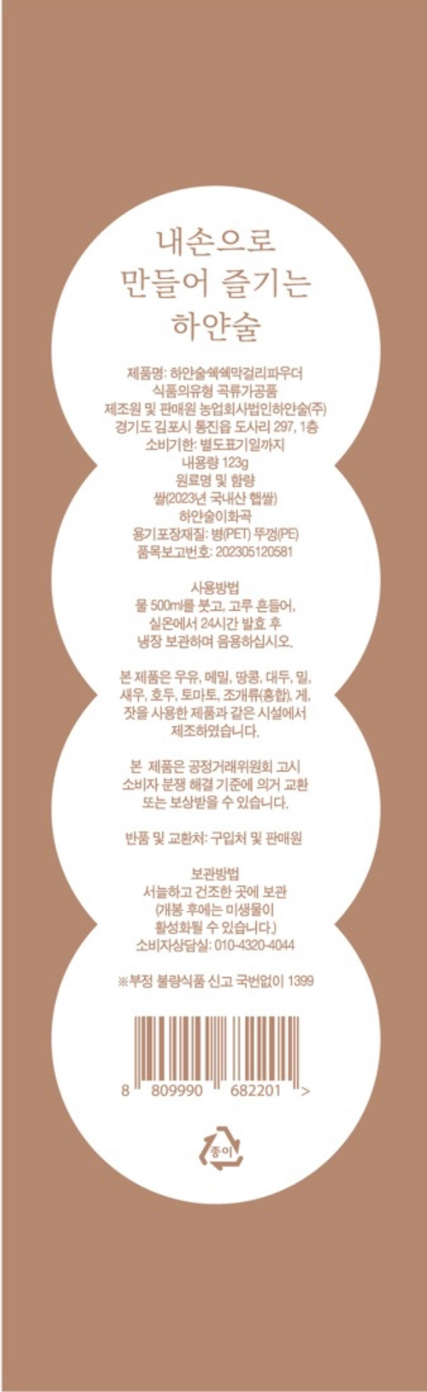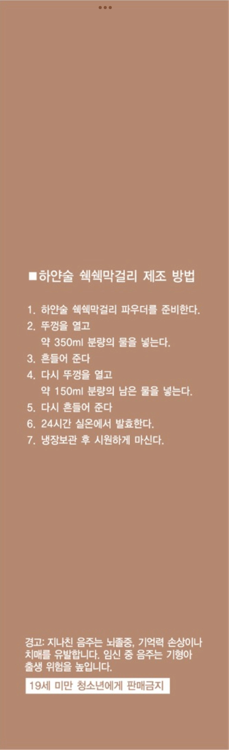박스에는 양조에 익숙하지 않으신 애주가를 위해 사용법을 기록해 두었습니다. 또한 커스텀 쉑쉑을 위한 가이드로 기록해 두었습니다. 세상에서 가장 작은 내 손안에 양조장 - 하얀술 쉑쉑막걸리 파우더를 즐겨보십시오.
