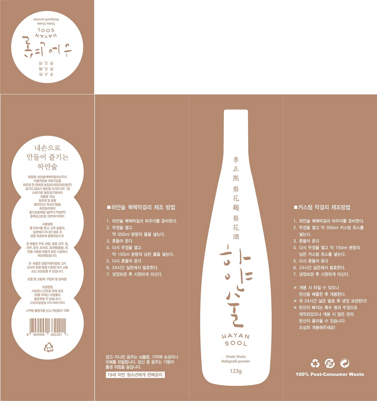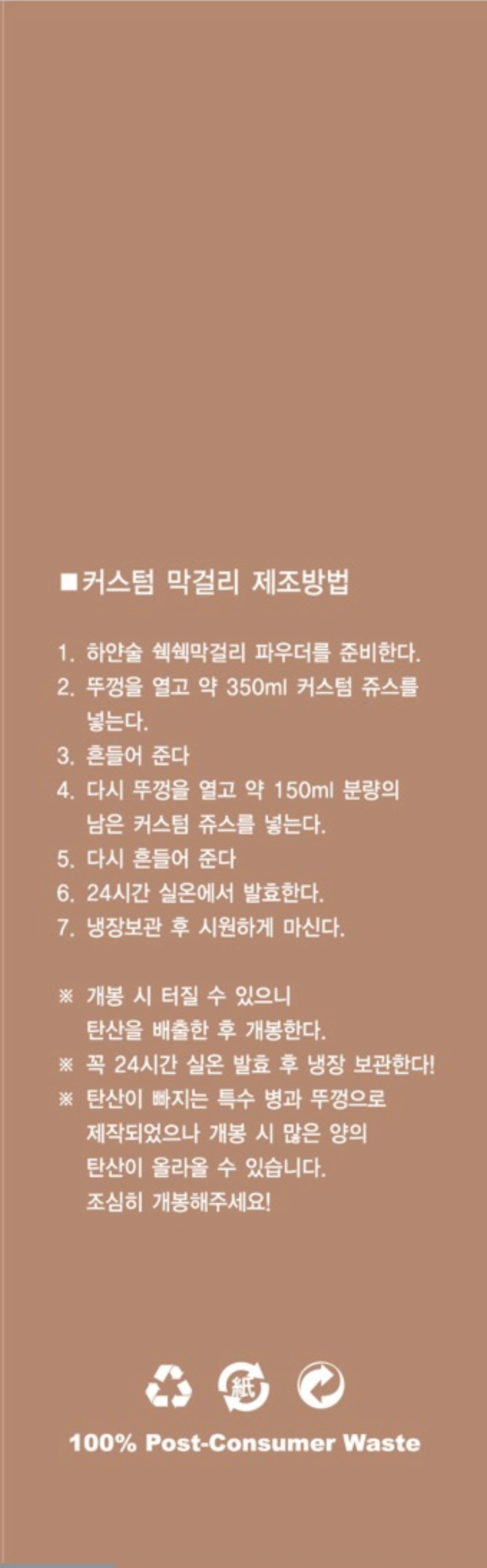 The bottle comes with a single sticker made of easy-to-remove material. You can remove the sticker and recycle it. We used special bottles and caps that allow carbonation to escape. There is no more expansion of the bottle due to carbonation. The box is uncoated and printed with eco-friendly printing. Coating on paper becomes industrial waste. The box of Hayansool Shake Shake Makgeolli Powder is 100% recyclable.