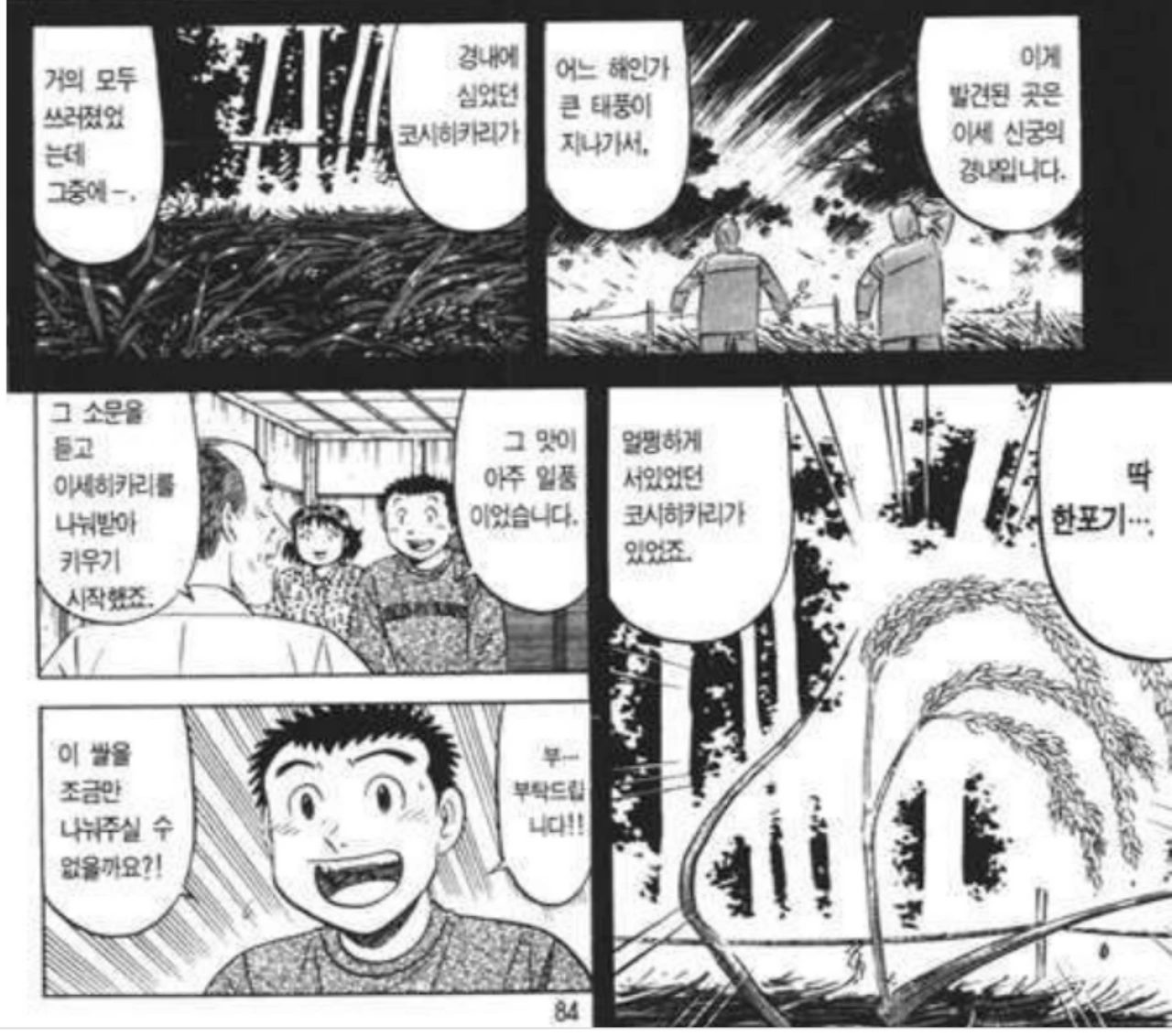 전국대회편 11권에서 고시히카리의 내풍성 변종인 이세히카리는, 이세신궁 내에서 재배하던 코시히카리가 딱 1포기 남았던 것을 모체로 한다고 서술했으나 실제로는 태풍 2번이 있었던 1989년에 2포기가 서 있었던 것으로 기록되어 있습니다. 미스터 초밥왕에서는 기적의 쌀임을 강조하기 위해 딱 1포기로 서술한 듯합니다.
