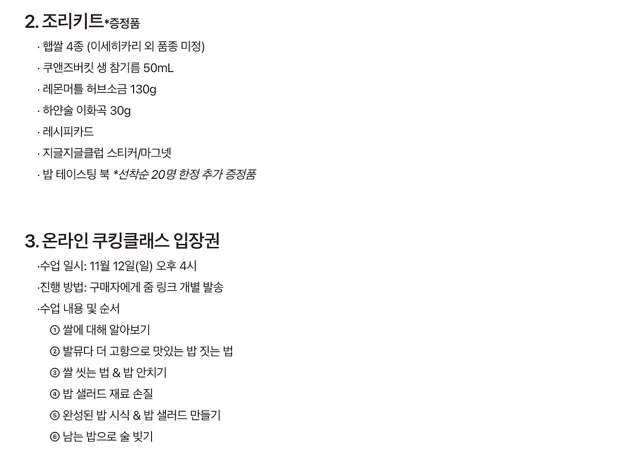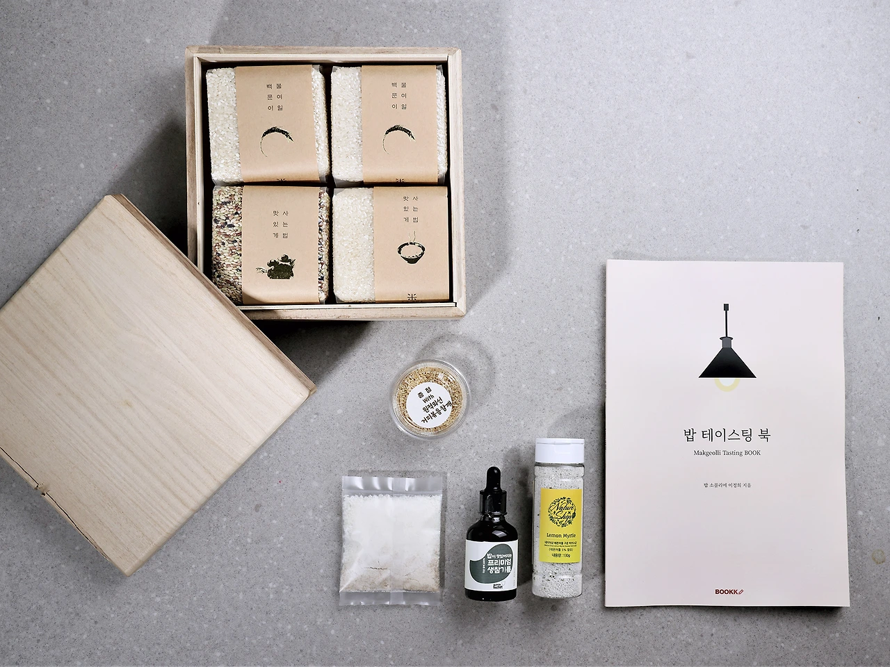 밥용생참기름(쿠엔즈버켓), 레몬머틀소금(네이처샵), 하얀술 이화곡(하얀술), 밥테이스팅북 등을 함께 보내드립니다.