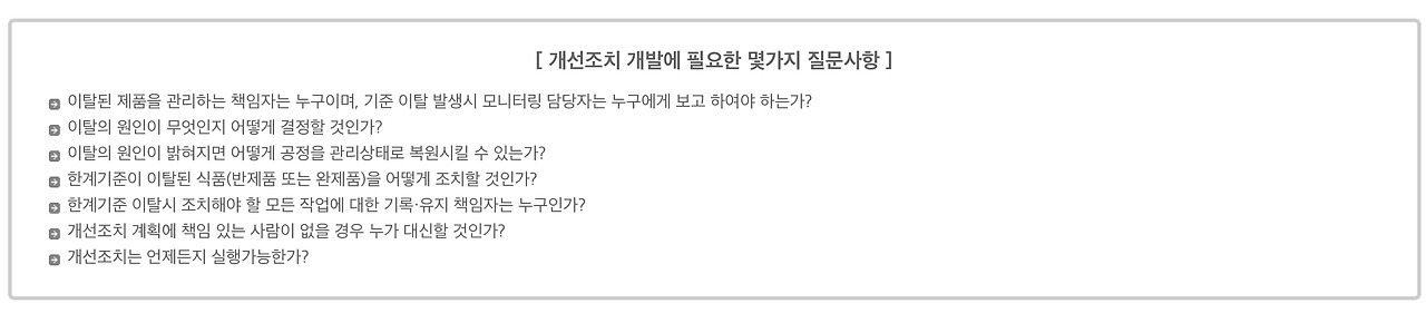 HACCP 관리계획은 식품으로 인한 위해요소가 발생하기 이전에 문제점을 미리 파악하고 시정하는 예방체계이므로, 모니터링 결과 한계기준을 벗어날 경우 취해야 할 개선조치를 사전에 설정하여 신속한 대응조치가 이루어지도록 하여야 한다.