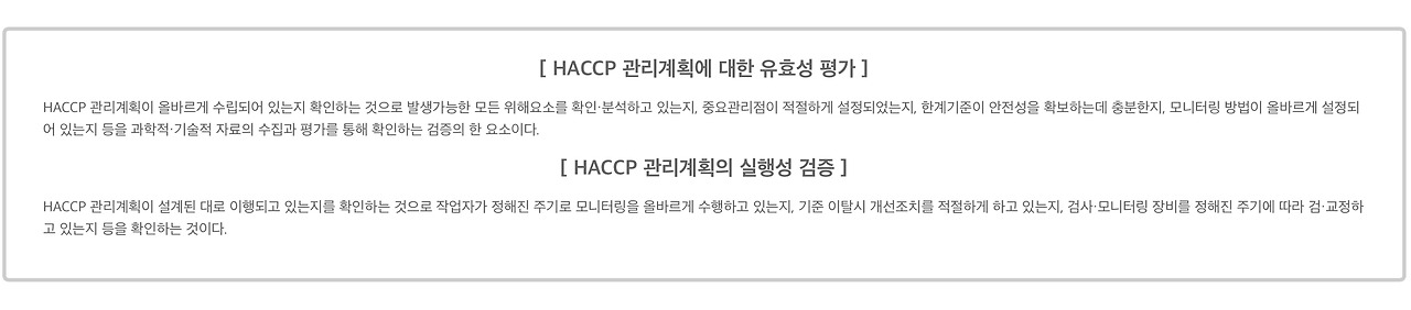 작성된 공정흐름도 및 평면도가 현장과 일치하는 지를 검증하는 것이다.공정흐름도 및 평면도가 실제 작업공정과 동일한지 여부를 확인하기 위하여 HACCP팀은 작업현장에서 공정별 각 단계를 직접 확인하면서 검증하여야 한다.
