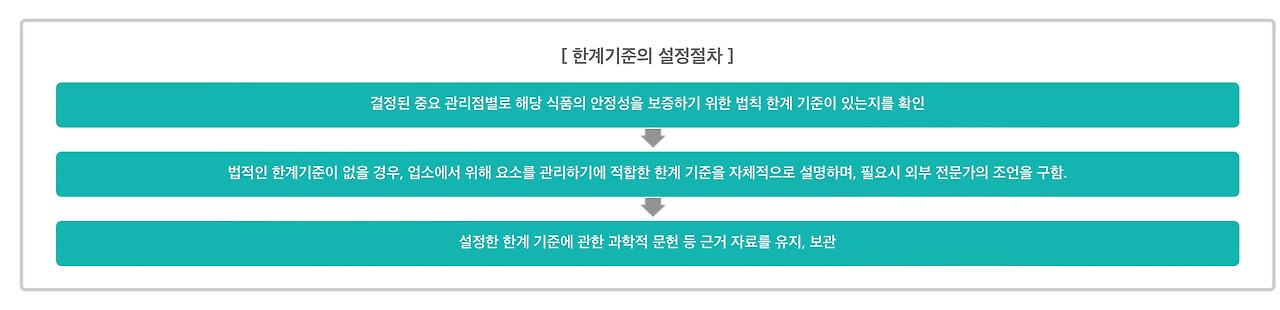 한계기준은 안전성을 보장할 수 있는 과학적 근거에 기초하여 설정되어야 한다. 한계기준을 결정할 때에는 법적 요구조건과 연구 논문이나 식품관련 전문서적, 전문가 조언, 생산공정의 기본자료 등 여러 가지 조건을 고려해야 한다. 예를 들면 제품 가열시 중심부의 최저온도, 특정온도까지 냉각시키는데 소요되는 최소시간, 제품에서 발견될 수 있는 금속조각(이물질)의 크기 등이 한계기준으로 설정될 수 있으며 이들 한계기준은 식품의 안전성을 보장할 수 있어야 한다.