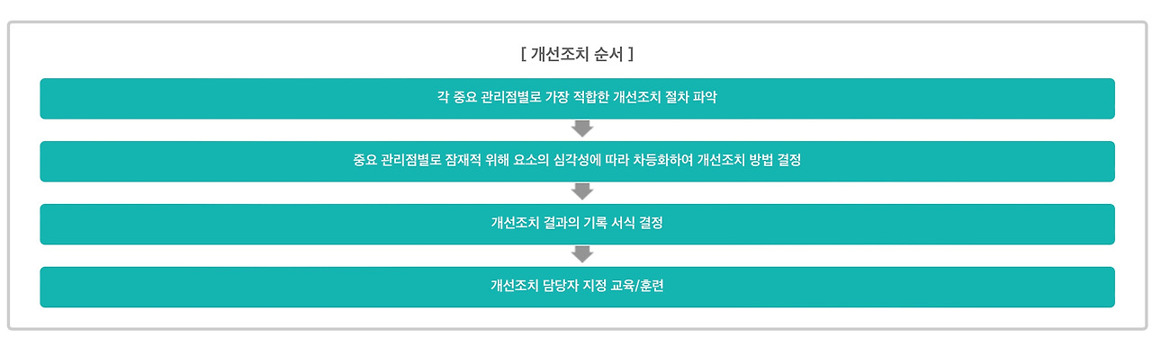 일반적으로 취해야할 개선조치 사항에는 공정상태의 원상복귀, 한계기준 이탈에 의해 영향을 받은 관련식품에 대한 조치사항, 이탈에 대한 원인규명 및 재발방지 조치, HACCP 관리계획의 변경 등이 포함된다.