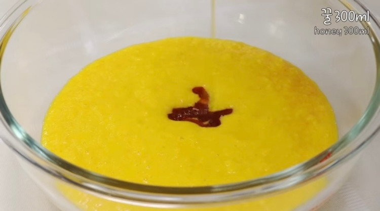 5. 간 귤에 꿀 300ml 섞어주세요.