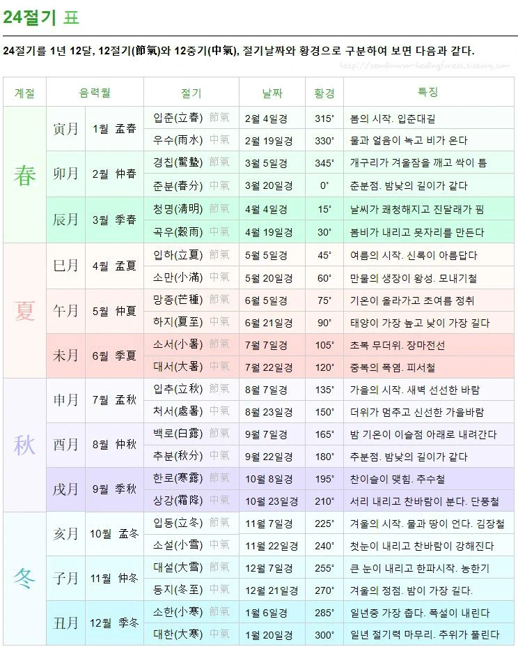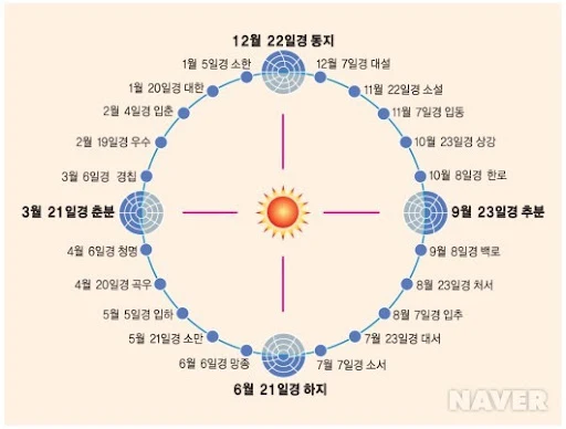 24절기는 3000년 전 주나라 때 태양의 운행에 의한 계절변화 패턴을 24개의 기준 절기로 나타낸 것이다. 입춘(立春, 봄이 왔음) 우수(雨水, 눈이 녹아 물이 됨), 경칩(驚蟄, 곤충들이 겨울잠에서 깨어남)과 같이 계절의 변화모습을 반영한 이름들로 지어졌다. 또한 춘분(春分) 추분(秋分)은 각각 봄과 가을의 한 가운데이자 밤낮의 길이가 정확히 같은 날들이고, 하지(夏至)와 동지(冬至) 역시 여름과 겨울의 한 가운데지만 각각 일년 중 낮의 길이가 가장 길거나 밤의 길이가 가장 긴 날이다.